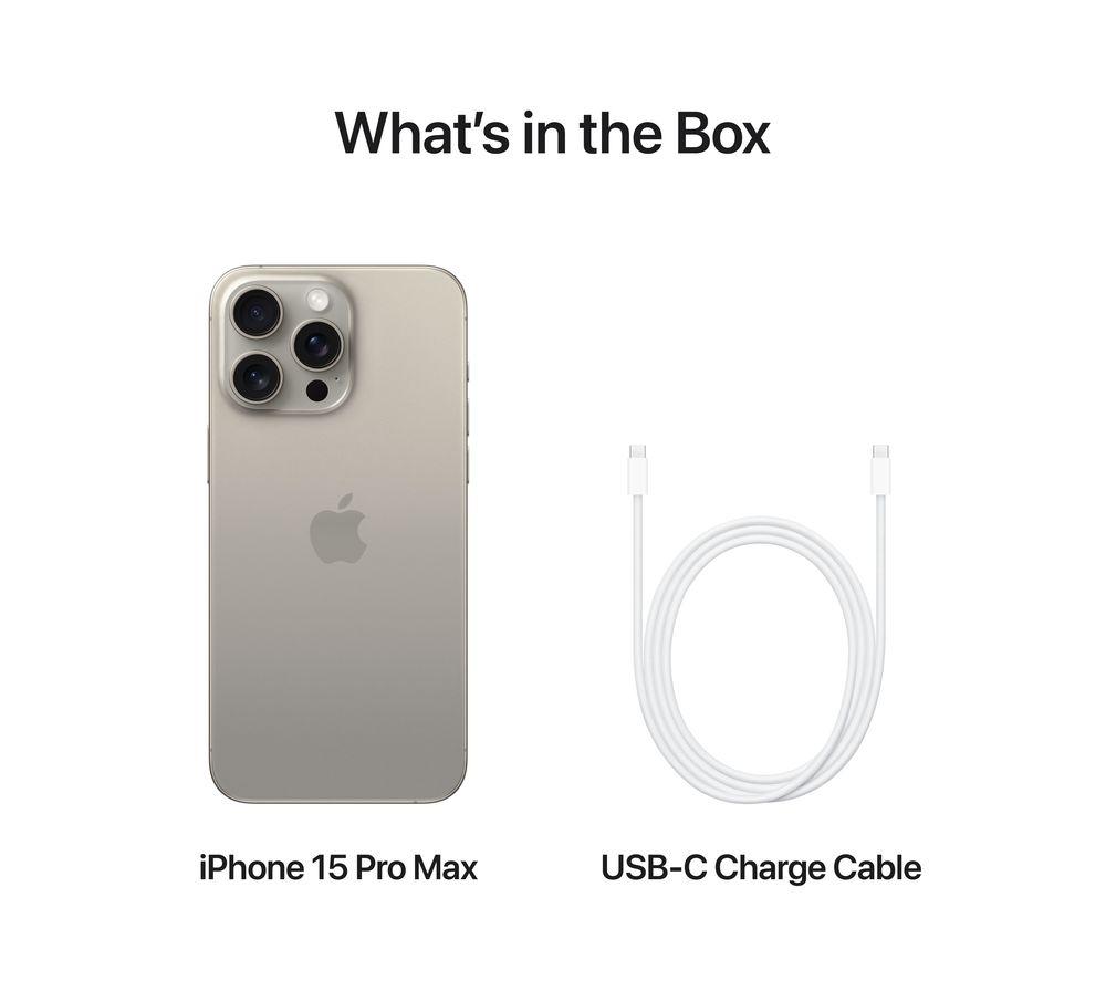 • Box contents :- iPhone 15 Pro Max- USB‑C Charge Cable (1m)- Documentation