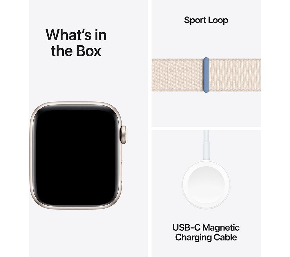 • Box contents :- Apple Watch SE (2023)- Apple Watch Magnetic Charger to USB-C Cable (1 m)
