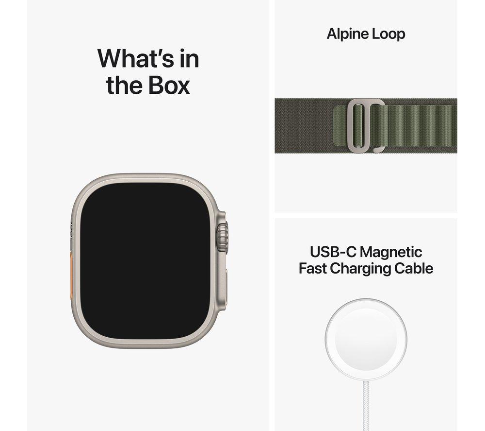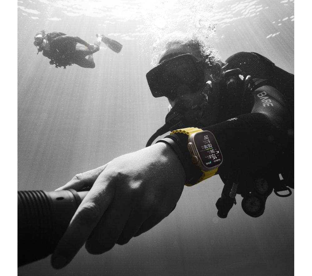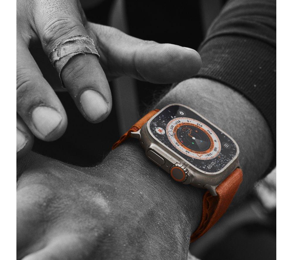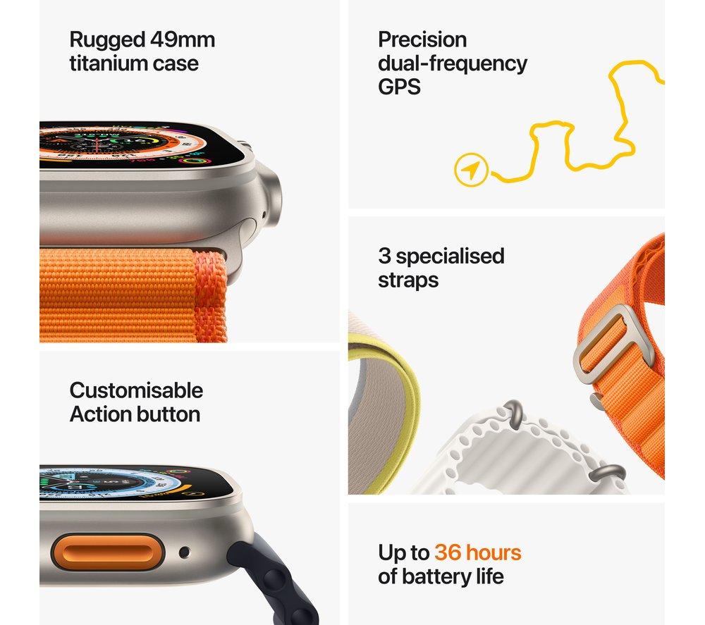 When adventure calls, Apple Watch Ultra has your back. The first thing you'll notice is the design – it's as tough as it looks. The robust titanium case is designed to protect your Watch from side impacts, and the Digital Crown is larger, so it's easier to use while you're wearing gloves. There's a large Action button that makes it easy to do things like set a waypoint. It's got the brightest Apple Watch display yet, so you'll be able to see it in glaring sunlight. When it gets dark, rotate the Digital Crown in Night Mode to turn the face a vivid red. When you're off the beaten track, you want location data you can trust, so it's got a dual-frequency GPS system that's really accurate. Designed for everything from deserts to mountains, the Apple Watch Ultra can cope with temperatures from -20 to 55°C, even if you don't fancy those extremes.Good to know- It's even at home underwater – it is EN13319 certified, and gives you all the data you need for diving down to 40 m depths- Designed with Huish Outdoors and with the Oceanic+ app, it's a dive computer on your wrist- The Alpine Loop band is one continuous woven piece with a titanium G-hook to keep it secure- It automatically changes to depth mode when you're underwater- The redesigned Compass app gives you loads of information about elevation, incline and more- If you need help finding your way home, Backtrack can help to guide you- Run into trouble? The 86 dB siren can be heard up to 180 m away- Get a massive 36 hours battery life with normal use, perfect for a longer adventure- The larger display means you can see up to 6 metrics at once for detailed tracking- Crash Detection, Fall Detection and Emergency SOS are all built in to help keep you safe