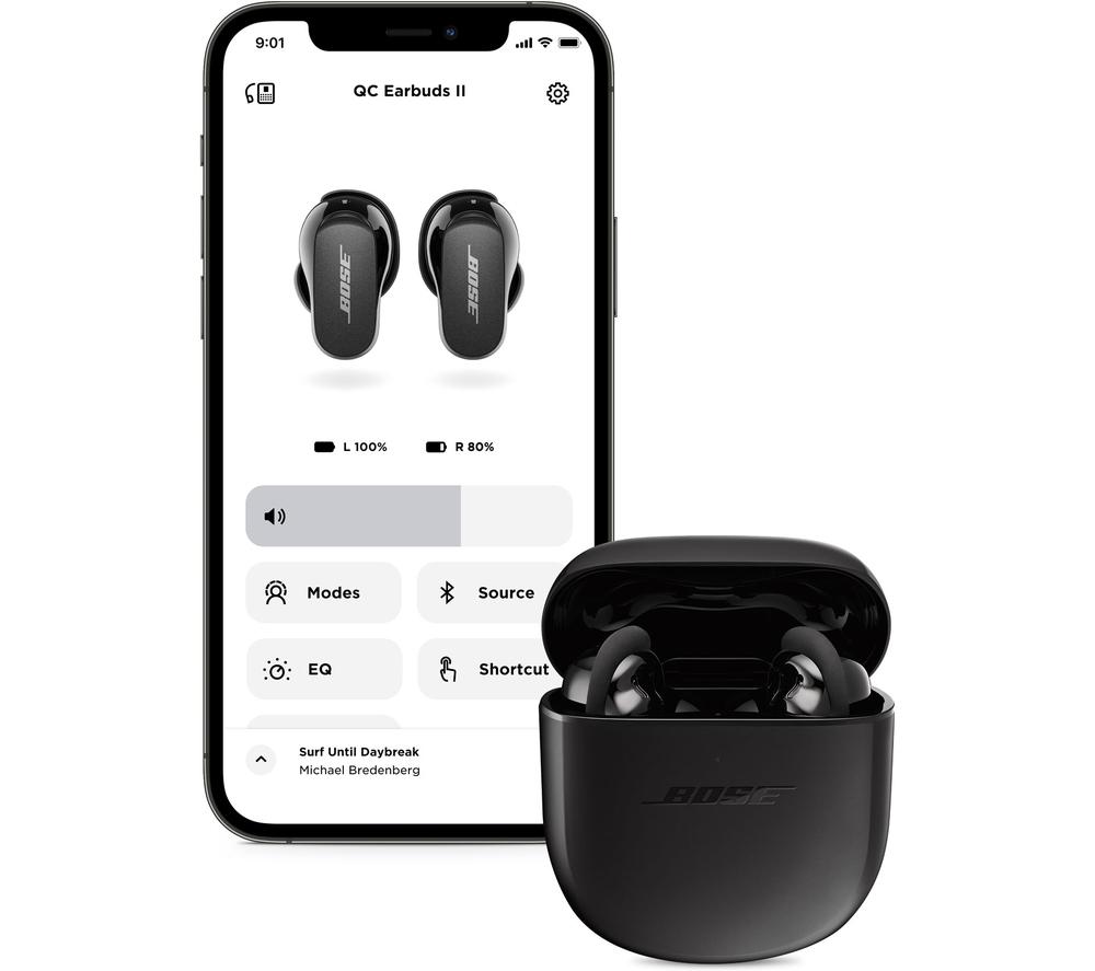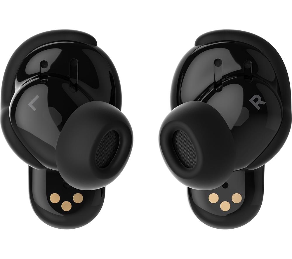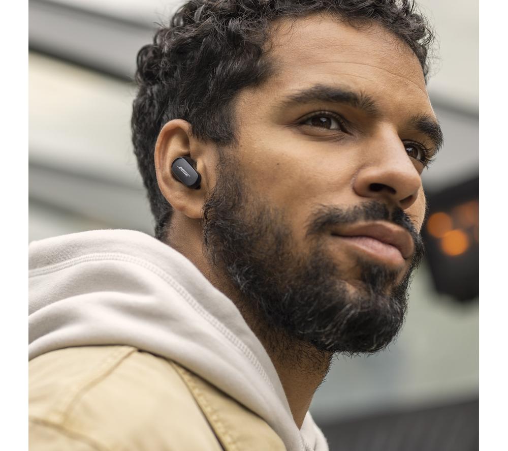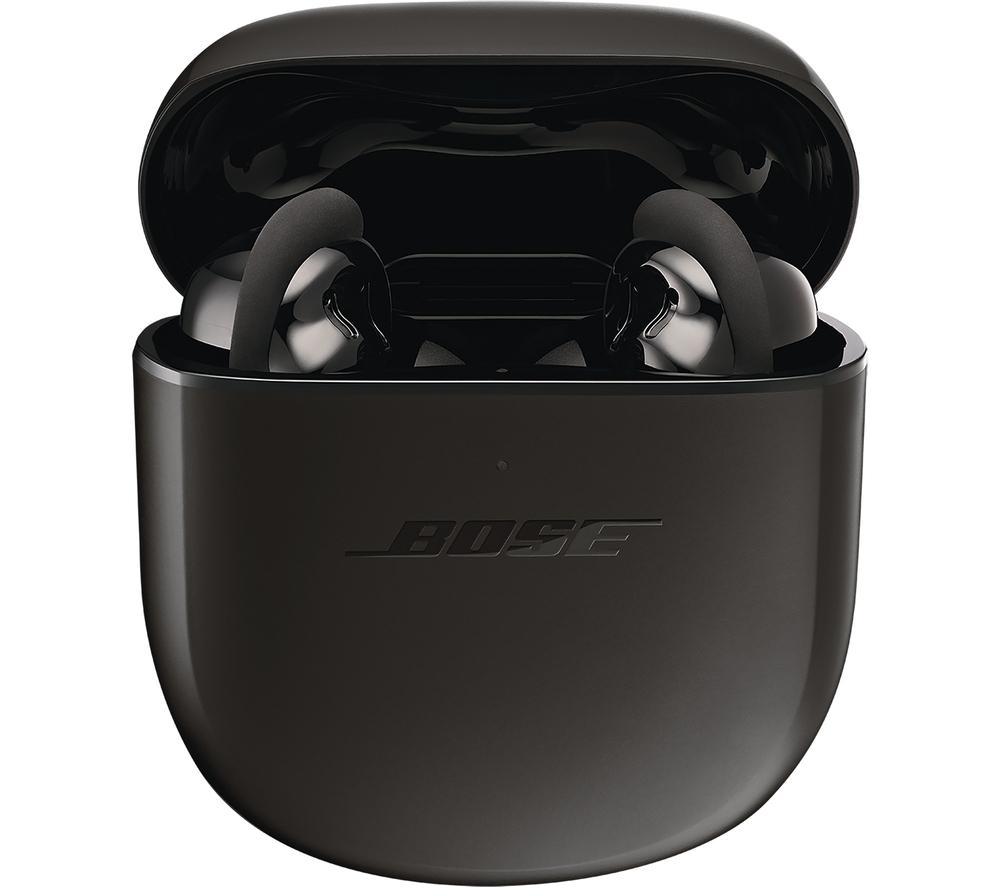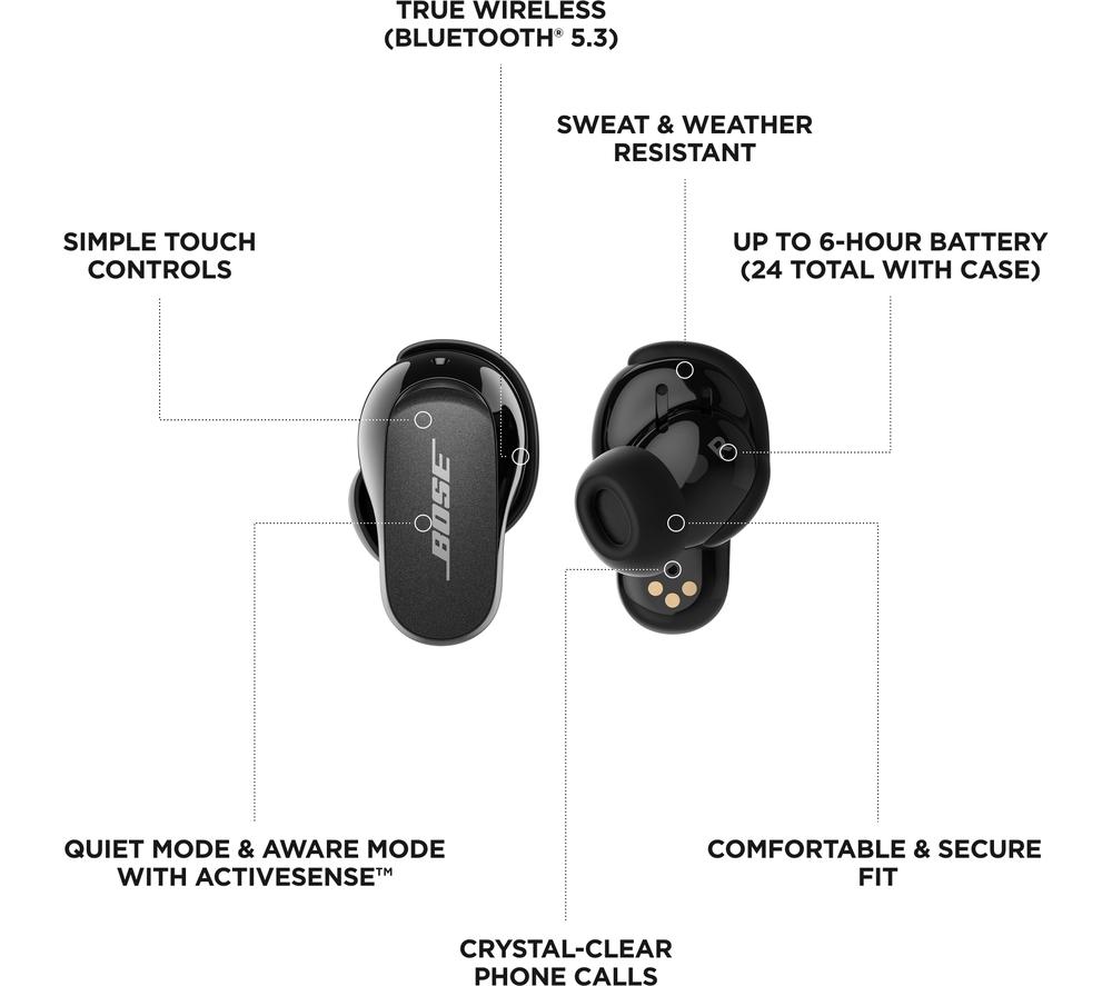 Like a sharp suit, everything is better when it's tailored to you. The Bose QuietComfort II Earbuds use CustomTune sound calibration that tweaks the sound and noise-cancelling to suit the way you listen. And these aren't just any old noise-cancelling earbuds. The QuietComfort II represent a revolutionary advance in noise-cancelling technology. It starts with the perfect fit for a tight seal – and the included Fit Kit makes sure you'll find it. Combined with mics which block out background chatter, you'll be able to appreciate songs in a whole new light – and catch every word of your audiobook. As you'd expect from Bose, there's no compromise when it comes to sound. Each wireless earbud is packed with custom-designed tech that delivers life-like and balanced sound with nuance, clarity, and depth.  Good to know  - You won't need to reach for your phone with simple touch controls for playback, calls, and noise-cancellation - Your music will automatically pause when you remove an earbud, so you can easily have a chat - Aware Mode lets you hear what's going on around you – and you can switch on ActiveSense to soften loud noises, like a passing bus- Noise-rejecting mics pick out your voice from your surroundings, so you'll be heard loud and clear on calls - The buds are water resistant, so you don't have to worry about getting caught in a downpour- You can take one of the earbuds out of your ear and the other one will keep playing – amazing for phone calls - Between listens, pop the earphones back in the case for up to 24 hours of listening time