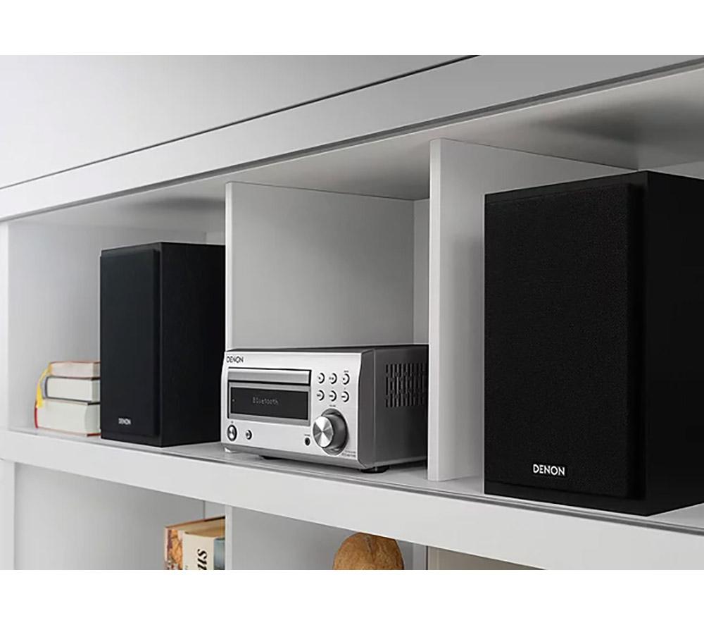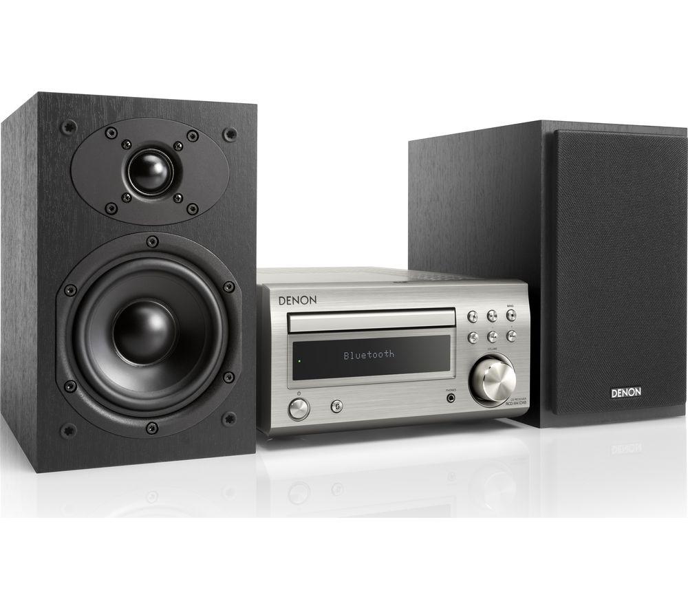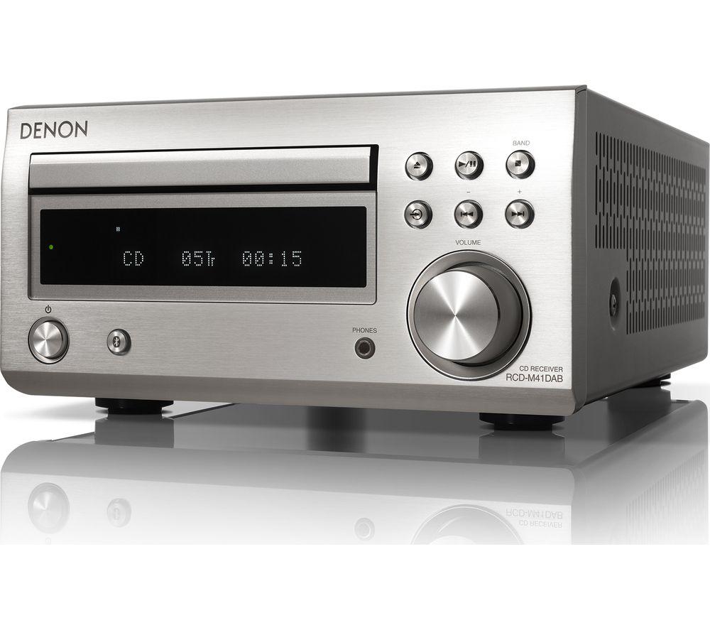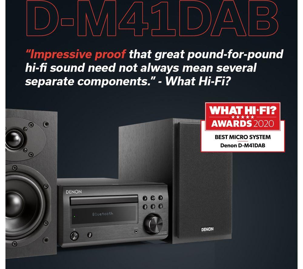 Top features:- Powerful 60 W sound from a small hi-fi system - Listen to CDs, and FM and DAB+ radio stations - Stream music wirelessly from your smartphone or tablet - Purer sound thanks to a Triple Noise Reduction Design Powerful 60 W soundIf you're running low on space but still want big sound, you'll love the Denon DM-41DAB Wireless Traditional Hi-Fi System. It delivers a powerful 60 W of audio from two speakers, for sound that fills small and medium-sized rooms. You'll be surprised at how loud a small hi-fi can be.Listen to CDs, and FM and DAB+ radioExpand your music options with multiple ways to listen. This hi-fi system has a CD player and FM, DAB and DAB+ radio stations to listen to.Stream music wirelesslyBuilt-in Bluetooth means you can wirelessly stream music from your smartphone, tablet or PC. So you're not just restricted to your CD collection, or what's on the radio.Purer soundThe Denon DM-41DAB is designed for purer sound from within. A simple circuit design inside the hi-fi lowers noise reduction. This means cleaner, pure sound at high volumes.