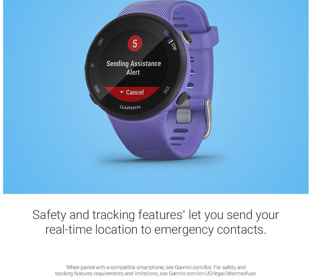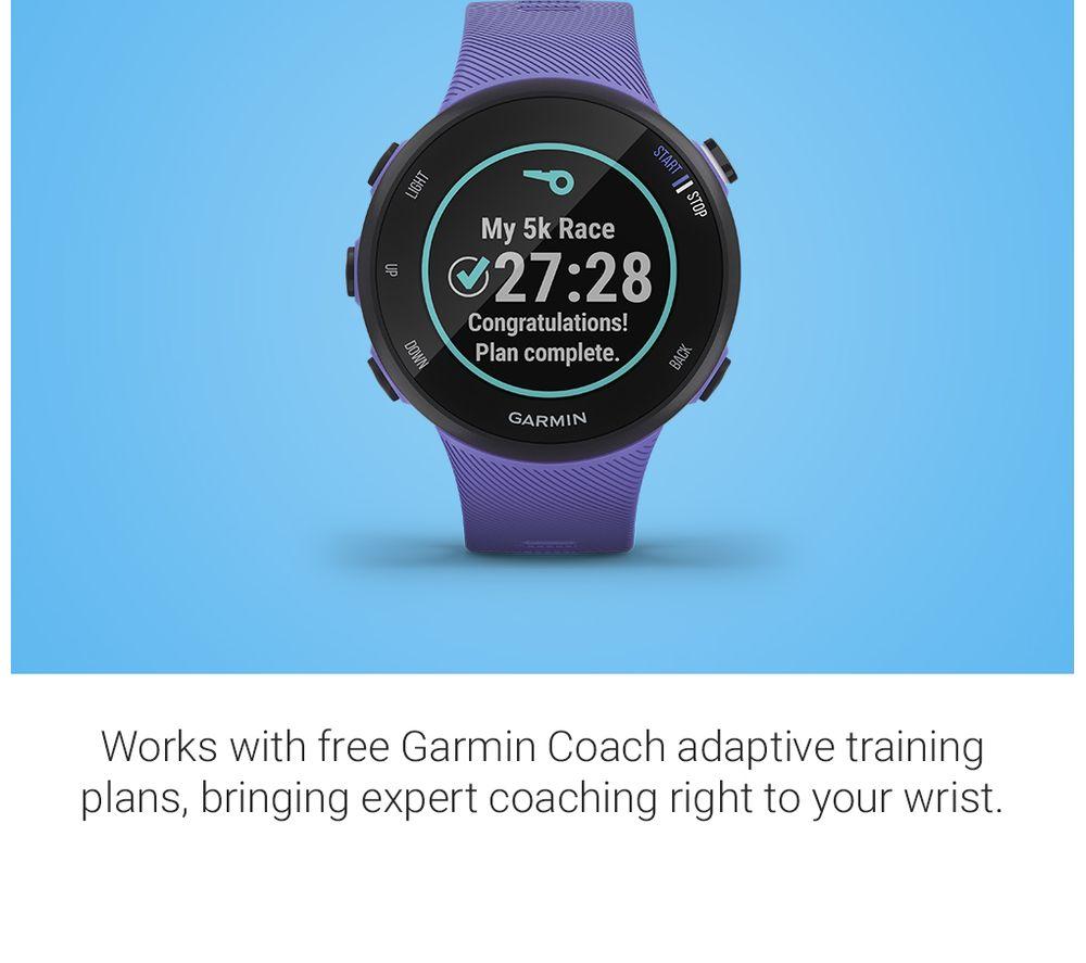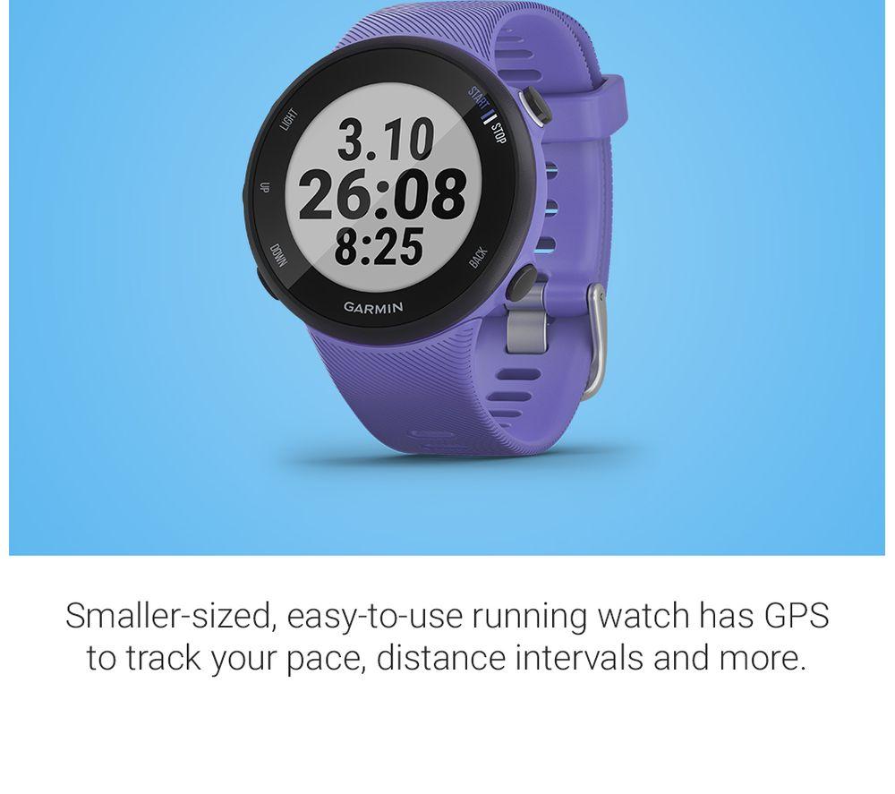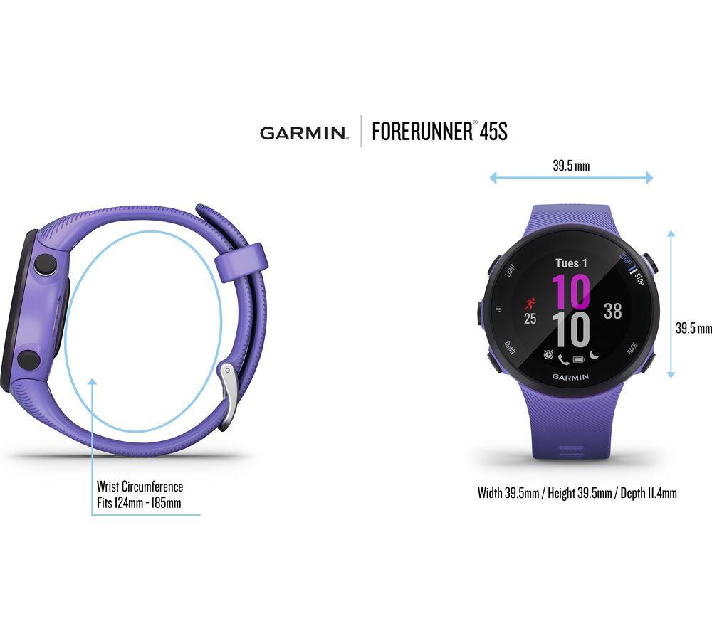 A running coach on your wristWhether you're training for a 5K or a half marathon, the Garmin Forerunner 45S Running Watch is here to help you reach your goals. View your distance, time, and pace as you run to stay on track. With just five buttons, it's easy to use with no fiddly controls. Mark a lap or skip a song on your workout playlist with a quick press of a button.Is the race fast approaching? Download the Garmin Coach app to receive a personalised training plan that syncs straight to your watch. It adapts to your progress, so if you're exceeding expectations your coach will always keep up to push you further.Track your healthStay informed about your wellbeing by tracking your heart rate, steps, calories and sleep. When worn 24/7, the collected data estimates your energy reserves, so you can find the most effective time for your workout.Read your texts without your phoneKeep your phone somewhere safe when you're out on your morning jog - simply pair the Garmin Forerunner 45S to your smartphone get notified of any incoming calls and texts or to skip tracks on your playlist.For peace of mind, you can choose to share your location with family and friends. Or it can automatically detect incidents and send an alert to your chosen contacts.