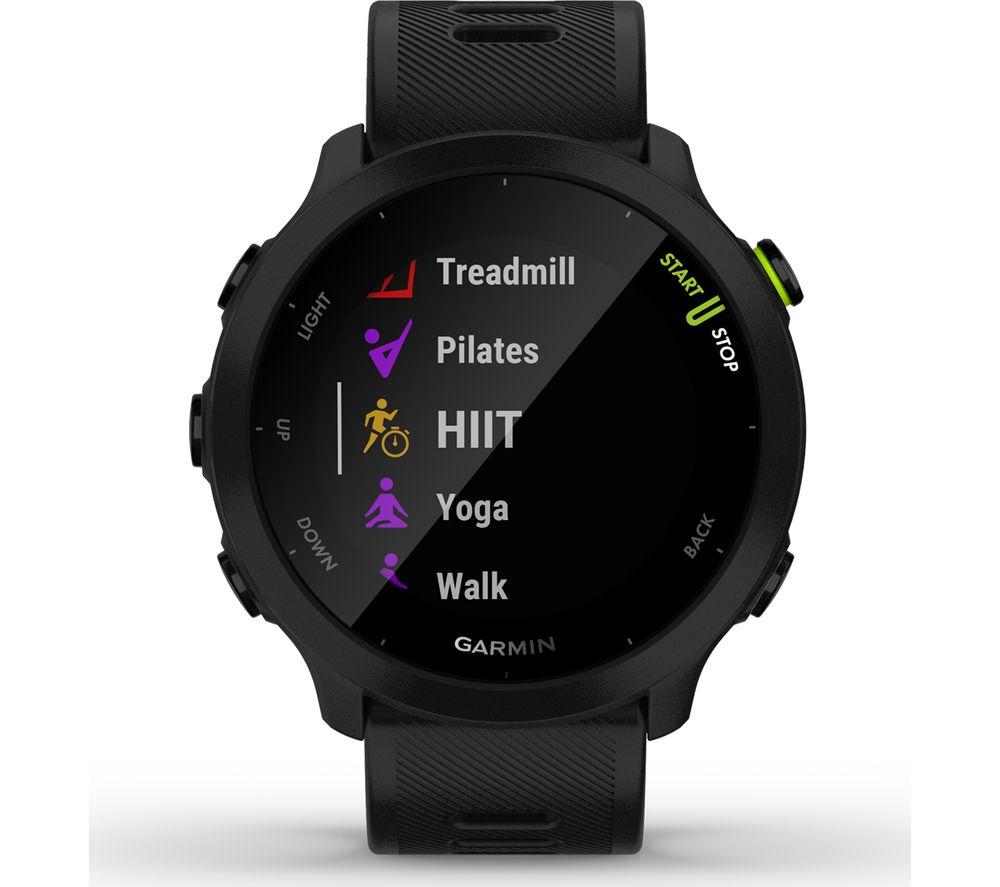 A running coach on your wrist Whether you're training for a 5K or a half marathon, the Garmin Forerunner 55 Running Watch is here to help you reach your goals. View your distance, time, and pace as you run to stay on track. With just five buttons, it's easy to use with no fiddly controls. Mark a lap or skip a song on your workout playlist with a quick press of a button. Is the race fast approaching? Download the Garmin Coach app to receive a personalised training plan that syncs straight to your watch. It adapts to your progress, so if you're exceeding expectations your coach will always keep up to push you further. Health tracking & activity profiles Stay informed about your wellbeing by tracking your heart rate, steps, calories and sleep. When worn 24/7, the collected data estimates your energy reserves, so you can find the most effective time for your workout. And it comes with pre-installed sports apps, including swimming, running, cycling and more - there's something for everyone. Read your texts without your phone Keep your phone somewhere safe when you're out on your morning jog - simply pair the Garmin Forerunner 55 to your smartphone get notified of any incoming calls and texts or to skip tracks on your playlist. For peace of mind, you can choose to share your location with family and friends. Or it can automatically detect incidents and send an alert to your chosen contacts. The display is easy to read too, even in direct sunlight.