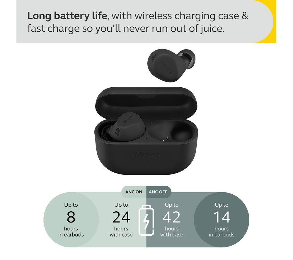 • Battery life :- Earbuds: Up to 8 hours (with ANC) / Up to 14 hours (without ANC)- Total with charging case: Up to 32 hours (with ANC) / Up to 56 hours (without ANC)