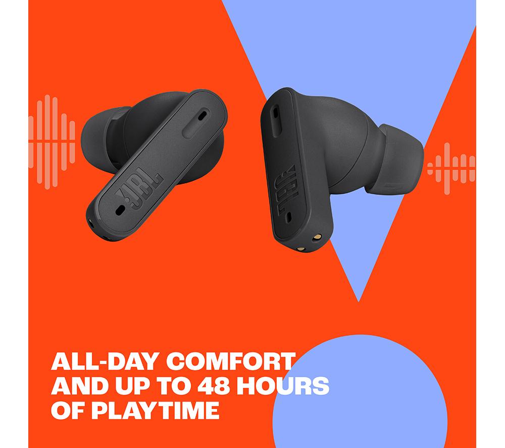 These JBL Tune Beam earbuds use JBL's Deep Bass Sound to give you high-quality audio with plenty of low-end thump. You'll feel every beat of your perfectly curated playlists when you're out and about. With Active Noise Cancelling, you can enjoy more of your music and less of the hustle and bustle around you. Better still, Smart Ambient technology lets you choose how much ambient sound you let in, so you'll never miss a train announcement again. Plus, these babies have an IP54 rating which means they're water and dust resistant, so they won't let you down even if the Great British weather does.Good to know- With 12 hours of battery and an extra 36 hours in the charging case, the tunes never have to stop- Need a quick boost? Speed charge for just 15 minutes and get an extra 4 hours of battery- The 4-microphone technology means you'll be heard loud and clear on your calls, even in busy environments- The closed stick design fits snugly in your ears, so you'll hear every note clearly and in comfort- Take control of your tunes with the JBL Headphone app and fine tune the EQ, turn on ANC or adjust ambient levels