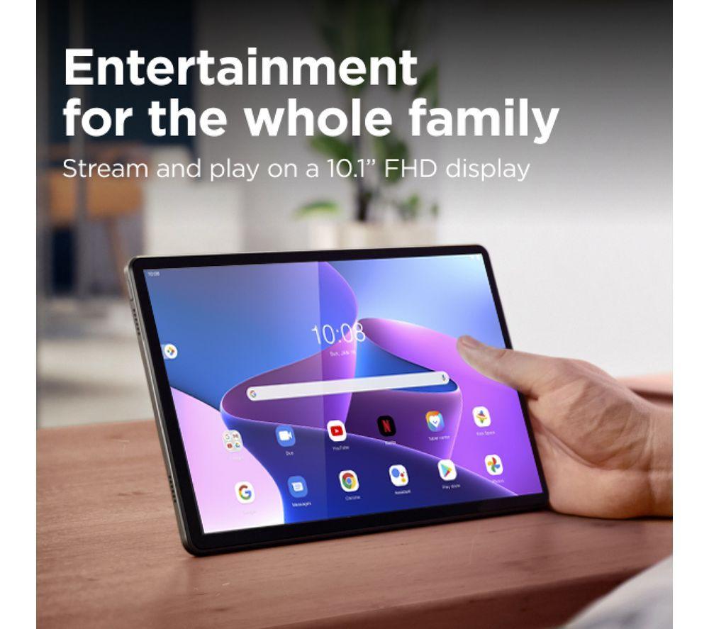 With the Lenovo Tab M10 tablet, you'll have all your apps, websites and media at your fingertips. The vibrant Full HD+ display makes your movies and TV shows look vivid and lifelike. And the dual speakers optimized with Dolby Atmos complement the visuals with amazing sound. You don't need to worry about running out of power. With up to 10 hours of battery life, it can get you through a day of browsing and chatting with enough juice left to watch your favourite show in the evening. Good to know - With an 5 MP camera on the front and 8 MP on the back, it's great for video calls too - The octa-core processor and 3 GB of RAM keep the system running smoothly even when multitasking - With Google Kids Space you can make sure your kids are staying safe online - There's a microSD card slot supporting up to 128 GB of extra storage for all your apps, photos, and videos - You eyes will be taken care of with the 10.1” TÜV-certified screen – it reduces harmful blue light emissions - You can take it anywhere - the aluminium body is both sturdy and elegant