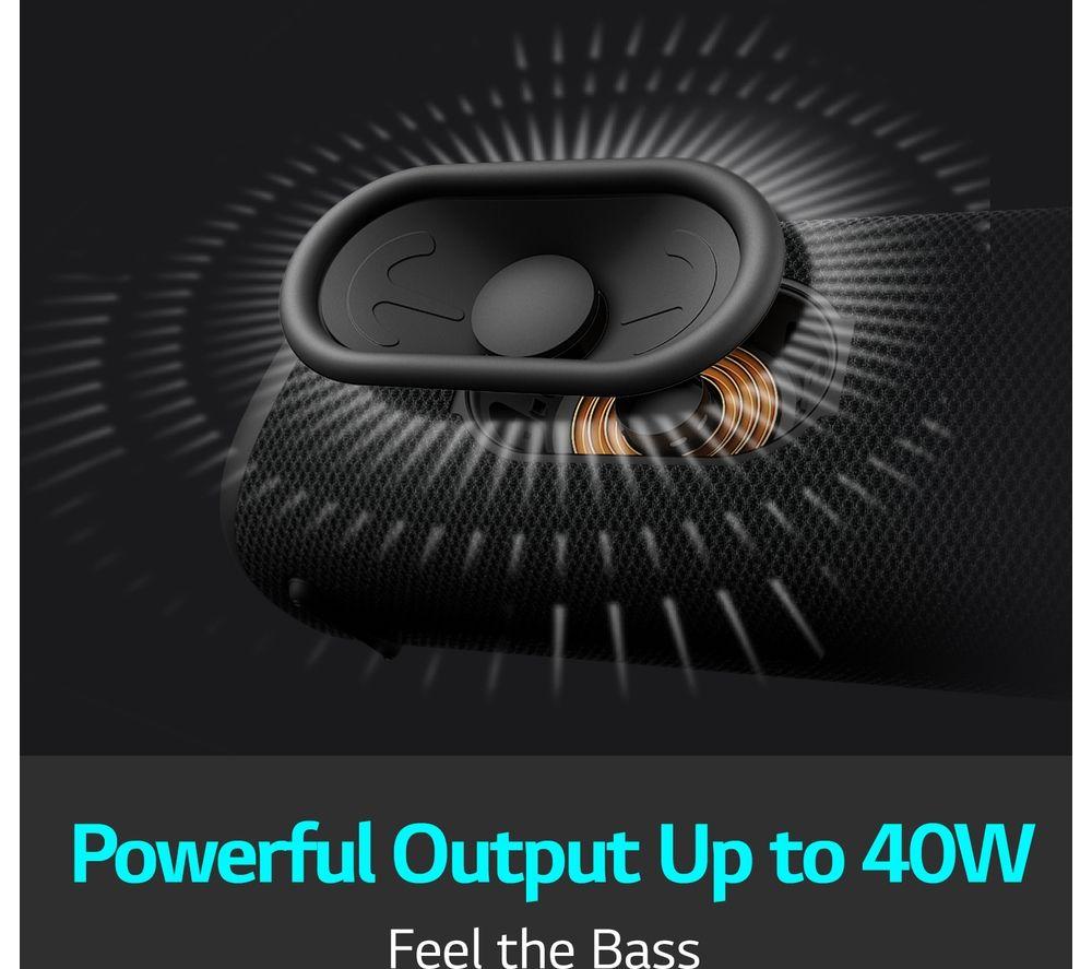 If the LG XBOOM Go XG7 doesn't get you in a party mood, nothing will. Don't let its small size fool you, this speaker packs a serious punch with 40 W of sound output. There's a track-type woofer for thumping bass and dome tweeter for clear, crisp highs. You'll hear (and feel) every distinct bass note, even when you turn the music down low thanks to the Bass Enhancement algorithm. LED lighting adds to the party vibe – play around with 16 million colours and enjoy the rainbow.Good to know- If you need to fill a large space, hit the Sound Boost button to widen the sound field- It's IP67 rated – aka dustproof and waterproof – so bring it to the beach or pool party- With up to 24 hours of battery life, the music can keep going well into the night – you can even charge your phone- Chat handsfree – and make sure everyone got their invite - with the built-in speakerphone