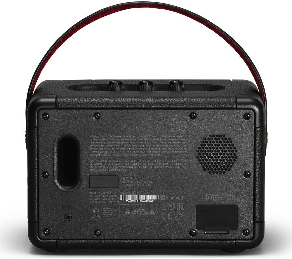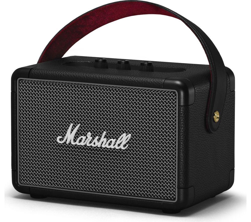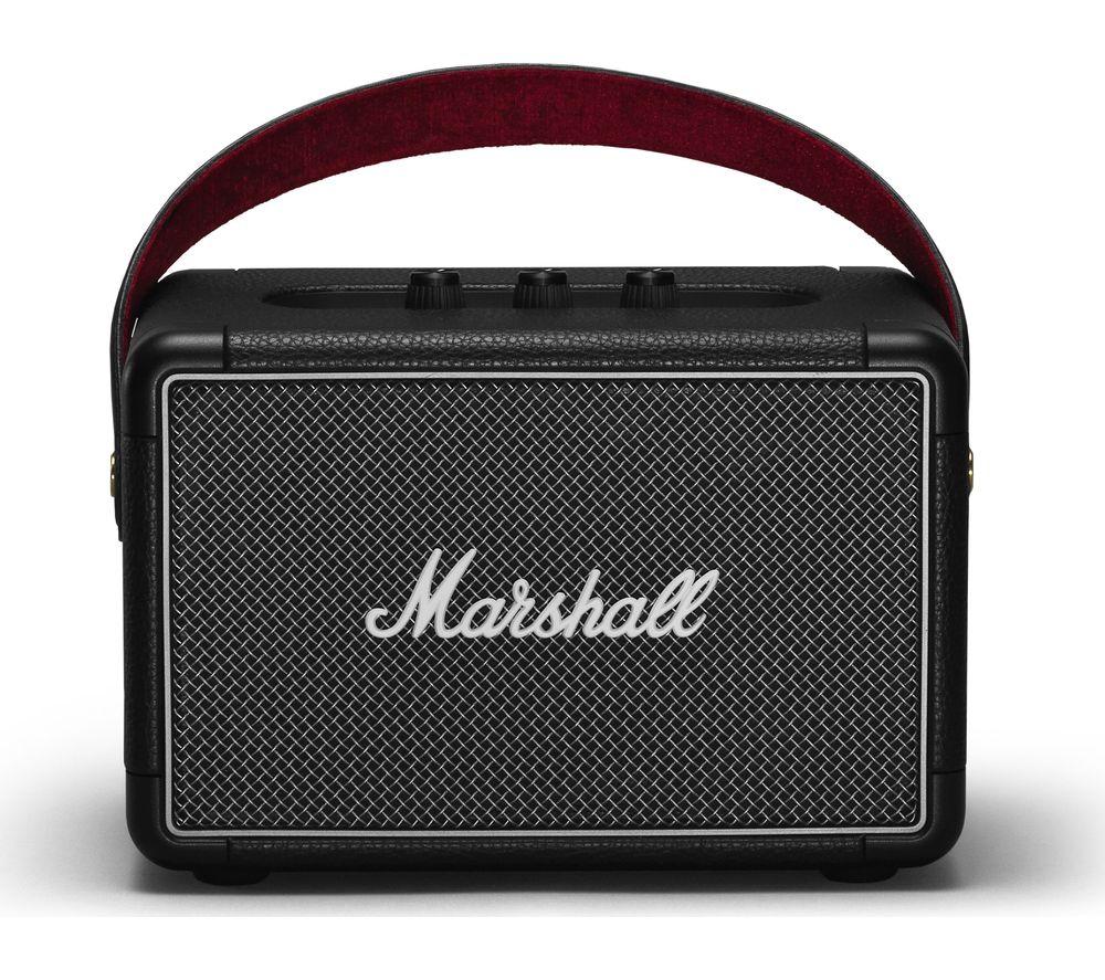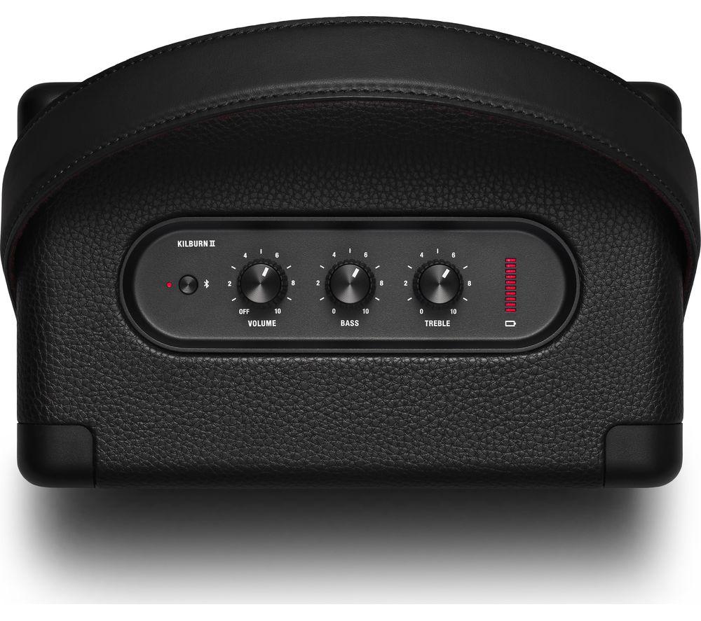 Top features: - Wireless listening with Bluetooth 5.0 - Built-in battery offers up to 20 hours of playback - Classic Marshall design with iconic logo Wireless listening Stream your favourite music from your Bluetooth-enabled smartphone, tablet, or PC to the Marshall Kilburn II Portable Bluetooth Speaker for powerful sound. With Bluetooth 5.0, it sounds just as clear as if you used a cable – though there's a jack for that too. Built-in battery Free from cables, you can setup the Kilburn II anywhere you like. The built-in rechargeable battery offers up to 20 hours of playback, or you can plug it directly into the mains. It takes only 20 minutes to get a three hour charge, and a full charge in under three hours. Classic Marshall design With a vintage-looking front fret, metal details, and the iconic script logo, the classic rock-n-roll design is unmistakeably Marshall. Don't worry about damaging the design while you're out and about, as the corners are subtly reinforced against drops and it's resistant to splashes and drizzle. The top plate has analogue controls for bass, treble, and volume, so you can fine-tune it to the exact sound you want.