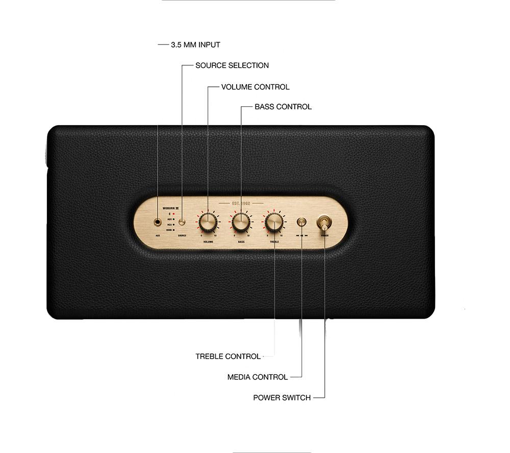 Bring some rock 'n' roll into your home with the Marshall Woburn III. Or Metal, or K-Pop. Whatever you're into, it'll sound amazing coming from this iconic speaker. Its woofer, 2 tweeters and 2 mid-range drivers create a wide sound stage that will fill your room with music. No matter where you put it, the Placement Compensation feature will make sure it sounds its best. You can also use it as a super-powerful TV speaker thanks to the HDMI input. And the brass knobs on top let you tweak the volume, bass and treble exactly how you like it all the way up to 10 (not 11, despite what Spinal Tap say). Good to know - Choose between RCA, HDMI, 3.5 mm jack or Bluetooth 5.2 for effortless connection - Dynamic Loudness will make sure your music sounds great at any volume - Enjoy a movie without waking up the neighbours thanks to Night Mode - The Marshall Bluetooth app lets you control the speaker and download updates