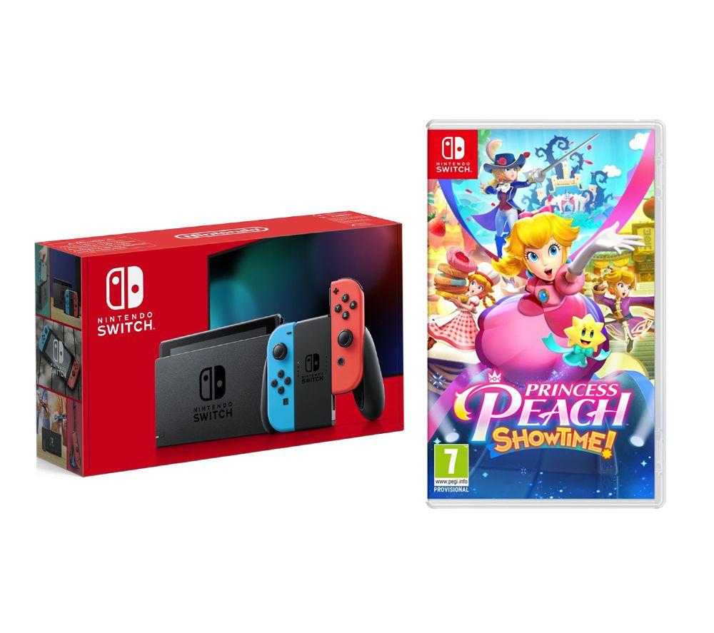 Play wherever you are with the Nintendo Switch & Princess Peach: Showtime Bundle________________________________________ Nintendo Switch - Neon Red & Blue All your Nintendo friends are on the Switch. Fancy games with Mario and Luigi, Link and Zelda or Pikachu and the other Pokémon? You can find all of them and many more exclusively on Switch. And you can take them with you anywhere you go! Nintendo Switch is a hybrid console - you can either hook it to your TV, or go handheld and play on its 6.2” screen. That means you can game any way you like, whether it's a lazy afternoon with the family or a commute to school or work. Good to know - Stuck on a long journey? That's more gaming time for you, the battery lasts from 4.5 up to 9 hours, depending on your game - It comes with two wireless Joy-Con controllers - each has a full set of buttons, so you're set for multiplayer right out of the box - Gaming on a TV is super easy – just pop the Switch in the included HDMI dock and you're off - There are 32 GB of internal memory for your games and save files, and you can easily expand with a microSD card________________________________________ Nintendo SWITCH Princess Peach: Showtime It's time to take centre stage and put on the show of a lifetime with Princess Peach: Showtime. Join Princess Peach in her own adventure at the Sparkle Theatre. The night quickly goes off script when the wicked witch, Grape, and her henchmen, the Sour Bunch, takeover. Help Peach as she takes the spotlight to fight to save the Sparkle Theatre and all the performers. Good to know - The theatre's guardian, Stella, will help you along your journey to reclaim the spotlight - Transforming into different costumes will give you new abilities – Draw your sword and say “En garde!” or solve a mystery as a detective