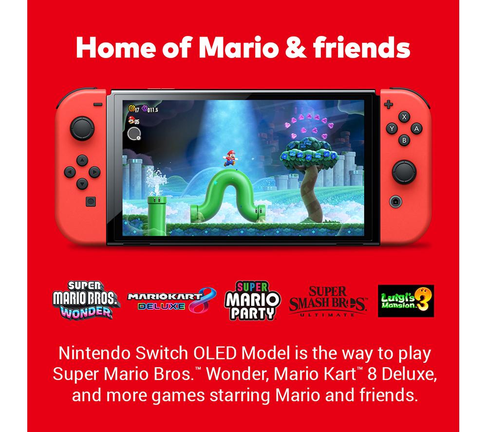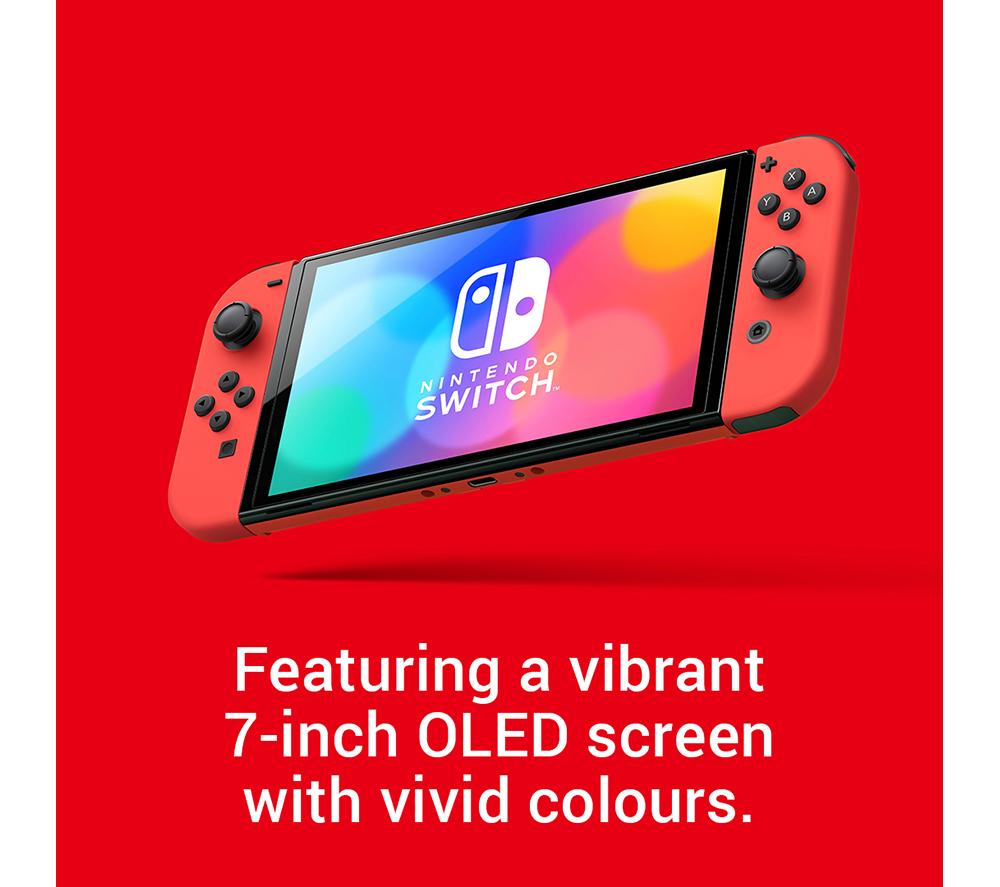 All your Nintendo friends are on the Switch. Fancy games with Mario and Luigi, Link and Zelda or Pikachu and the other Pokémon? You can find all of them and many more exclusively on Switch. And you can take them with you anywhere you go! Nintendo Switch is a hybrid console - you can either hook it to your TV, or go handheld and play on its 7” screen. That means you can game any way you like, whether it's a lazy afternoon with the family or a commute to school or work.Good to know - This OLED version's display is a real win-win – it's larger, has nicer colours and sharper contrast and makes the console slimmer! - Stuck on a long journey? That's more gaming time for you, the battery lasts from 4.5 up to 9 hours, depending on your game - It comes with two wireless Joy-Con controllers - each has a full set of buttons, so you're set for multiplayer right out of the box - Gaming on a TV is super easy – just pop the Switch in the included dock and you're off - A wired LAN port on the dock gives you a more reliable alternative to WiFi connection – perfect if you take online gaming seriously - There are 64 GB of internal memory for your games and save files, and you can easily expand with a microSD card