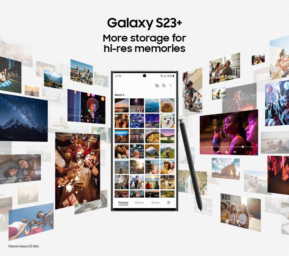 The Galaxy S23+ has got your back, day and night. With the 50 MP triple rear cameras you can always pick the right lens to get the perfect photo. From super-wide landscapes to tiny details. And because some of the best memories are made after sunset, Nightography lets you take clear pics, even in the dark. The Full HD+ AMOLED display is huge and a treat to look at – perfect for binging TV shows. Its 120 Hz refresh rate and stunning colours make movies and games come to life in your hands. It's super bright too, so it even looks great in direct sunlight. The massive 4700 mAh battery will make sure you don't run out of juice before the day is over. And to make the S23+ even smarter, there's Galaxy AI. It's at your service 24/7 to help with everything from the small things to the big tasks.Good to know- With Photo Assist you can move subjects, remove distractions and so much more with just a few taps- Break down language barriers during calls - Live Translate lets both people speak and hear their own language- Note Assist spits out bite-sized summaries of long articles in seconds, so you can read more in less time- Where's that sweater from? Circle to Search with Google lets you search objects in your photos just by circling them- The Qualcomm 8 Gen 2 Processor will easily power through any app or game- With 8 GB of RAM you can multitask in several apps at once without slowdowns- 5G connectivity lets you stream films and shows on-the-go – even when you're on the bus to work- You can record video in whopping 8K resolution or in 4K at 60 fps – your videos have never looked so crisp- The 12 MP front camera is perfect for selfies with your friends, and Zoom calls with your family- Facial recognition and fingerprint scanning keeps your personal files safe, secure and for your eyes only- Thanks to the AKG speakers with Dolby Atmos, the movies you watch will sound as good as they'll look- With 45 W Super Fast Charging and wireless charging, you've got plenty of ways to top up the battery- You can wirelessly charge your gadgets from the phone with Wireless PowerShare- Splashes or rain showers don't need to worry you – the S23+ has an IP68 rating