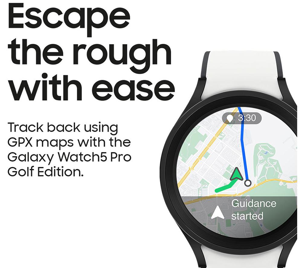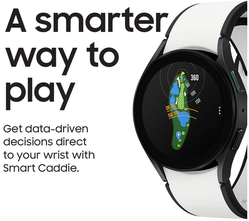 Bring your A game to the green with this Golf Edition of the Samsung Watch5. Scope out the course before you tee off with Smart Caddie. Search from over 40,000 courses worldwide and keep a fully zoomable map right on your wrist. This watch has a few other tricks up its sleeve too. Align yourself with the flagstick using the Pin Direction compass and log how far your ball travelled with Shot Tracking. It'll even suggest the best club to grab. It looks the part too with a matching two-tone band, exclusive watch face, and green home button.Good to know- A handy score input screen pops up automatically after each hole, so you won't forget to keep track of the score- Voice Guidance can walk you through the course information as you play- Guide for Course Targeting lets you plan your shot with touch-targeting, shot history, and remaining distances to the green- It can help you keep an eye on your health by monitoring important metrics, like heart rate, blood pressure, and body composition- The sapphire crystal glass provides excellent protection against scratches- With up to 40 hours of battery life, you won't lose any progress mid-game- Buy your morning coffee with a tap of your watch using Samsung Pay or Google Wallet___________________________________________________________________________Please note: Samsung Pay is not currently available in Ireland.