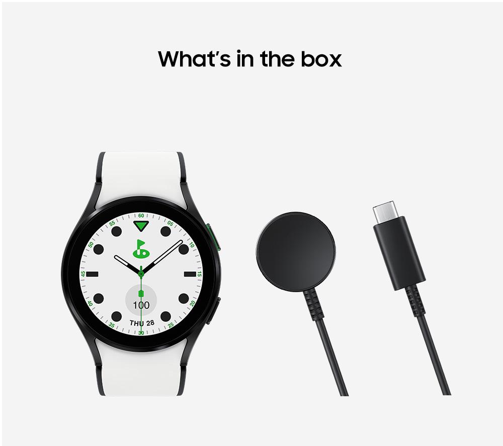 • Box contents :- Samsung Galaxy Watch5 BT Golf Edition- Strap- Wireless charging pad- Quick start guide