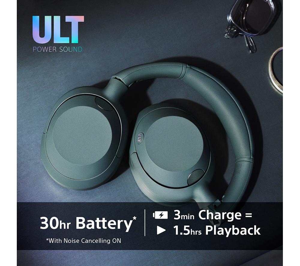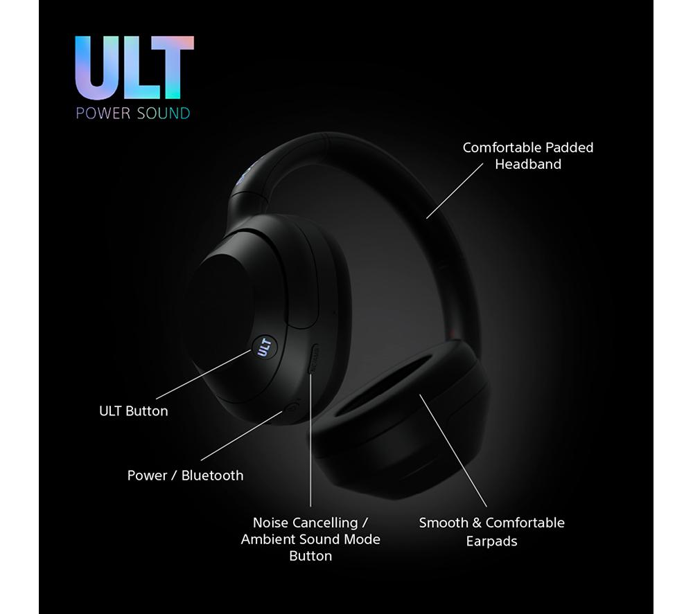 Feel the full force of your tunes with these Sony wireless headphones. The high-quality 40 mm Neodymium drivers fill your ears with powerful, dynamic sound – you'll hear every lyric, riff and beat in crystal clarity. However you like your low end, the ULT button will satisfy your bassline addiction. Choose from Deep Bass and Attack Bass modes to go from chest-thumping to teeth-rattling in a flash. Good music deserves your full attention. Active noise-cancelling blocks out annoying distractions like street noise and background chatter, so it's just your music. And when you need to be aware of your surroundings, Ambient Mode lets the world come flooding back in.Good to know- The soft earpads and smooth headband are nice and comfy so they won't get on your nerves- Come through loud and clear on your calls thanks to Sony's Precise Voice Pickup technology and beamforming mics- Go from watching a movie on your tablet to taking a call on your phone automatically with multipoint connection- Enjoy 30 hours of battery from a single charge – turn off noise-cancelling and it jumps to a massive 50 hours- Need some extra juice? Quick charge gives you 1.5 hours of use from just 3 minutes of charge- They're compatible with both IOS and Android devices and connect easily with Fast Pair and Swift Pair- When you're done rocking out, they can be folded down and stashed in the handy carry case