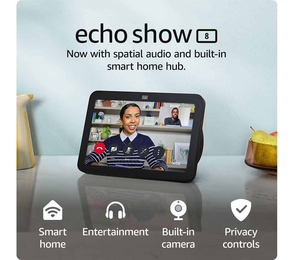 The Echo Show 8 is your everything hub. Want to watch a cooking show, dim your Hue lights, or top up your shopping list? It does all that and more. This 3rd gen speaker has a had a nice upgrade with spatial audio. It cleverly fine-tunes the acoustics to suit your space, so you get the best room-filling sound. It's the perfect excuse to catch up on a Netflix or Prime series on the 8” HD screen while prepping dinner. The Echo doubles as a hub for all your connected gadgets too. Even third-party stuff, as long as it's got Zigbee, Matter or Thread. You'll be able to answer your doorbell cam or set up routines for your lights. And of course, Alexa, the built-in voice assistant, is always on hand to help.Good to know- Fancy a natter? Use the 13 MP camera to make video calls to loved ones (they just need an Echo device or the Alexa app)- Your music, your way – listen to your playlists on the likes of Spotify, Apple Music, or Amazon Music- Don't let those memories fade – pick your favourite family photos and holiday snaps to relive with Photo Frame mode- Parental controls make it safe for the whole family to use – little ones can learn and have fun with Amazon Kids+- Set your Alexa Privacy settings on the app or by asking Alexa – there's a mic-off button and built-in camera cover too- It's super simple to set up – just plug in and use the Alexa app to connect to WiFi and get started_______________________________________Please note: Certain skills and services may require a subscription or other fees.