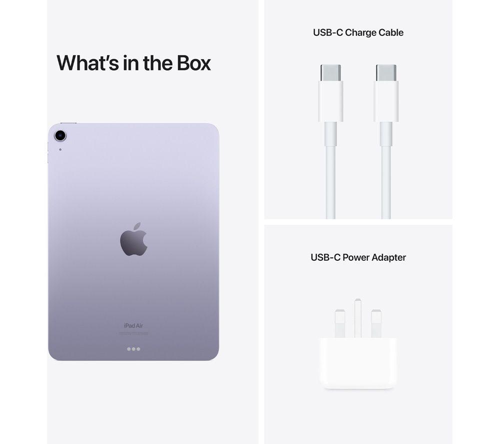 • Box contents :- Apple 10.9' iPad Air (2022)- USB Type-C charging cable 1 m- USB Type-C power adapter
