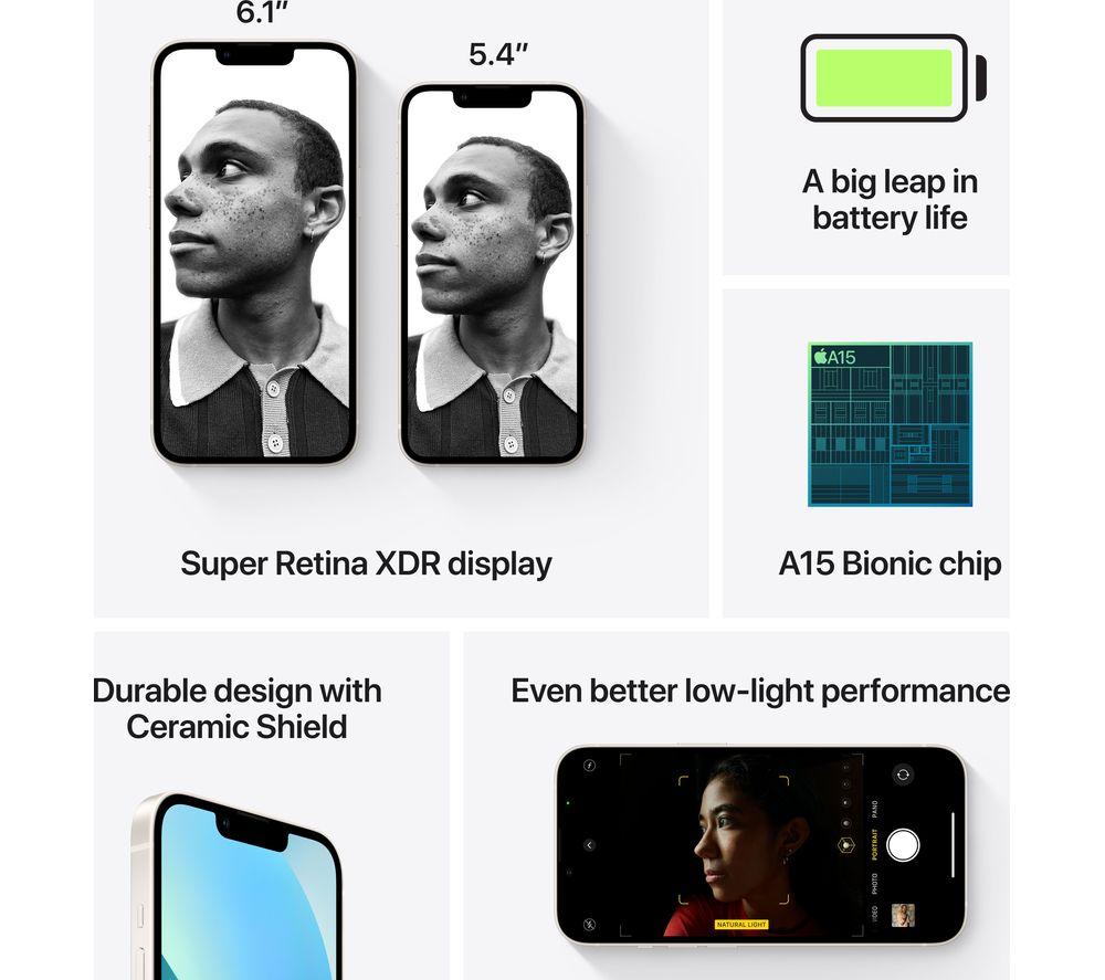Apple iPhone 13 and its A15 bionic chip are ready for anything – apps, games, even video editing. Which is handy because you'll get great 4K video from the 12 MP dual camera system. It even has an ultra-wide lens so you can fit the whole family in your holiday snaps! And whether you're flicking through memories or binging on Apple TV, everything will look awesome on the 6.1\