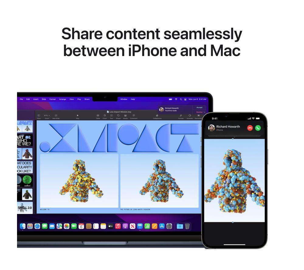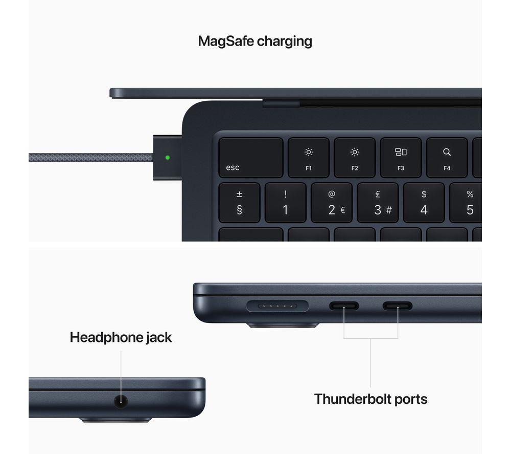 Your tasks, done faster. Built around the M2 chip, the redesigned 2022 MacBook Air has an improved CPU and GPU - 1.4x faster than the M1. And that's all while using less power. You get up to 18 hours of battery life, so you won't be hunting for plug sockets. That means it's a powerhouse for editing on the go - whether you're trimming down 4K footage or putting the final touches to an animation. And it's all wrapped up in a super thin yet durable all-aluminium enclosure.Good to know- Chat to your friends in sharp Full HD with the upgraded 1080p FaceTime HD camera- For complete colour accuracy when you're working on creative projects, the Liquid Retina display shows over a billion colours- True Tone technology automatically adjusts the brightness and warmth of the screen, so you can read in comfort- With improved vocal clarity and Spatial Audio support, the four-speaker sound system will add extra immersion to whatever you're watching- Touch ID lets you unlock your Mac with your fingerprint, so you can keep your files safe and shop online with Apple Pay- Connect everything you need (with speed) thanks to the two Thunderbolt 4 ports- The MagSafe cable attaches magnetically for an easy connection when you need to recharge- It's compatible with your most used apps, from Microsoft 365 to Zoom and loads of iPad and iPhone apps too- The 256 GB SSD lets you load up your photos and apps almost instantly