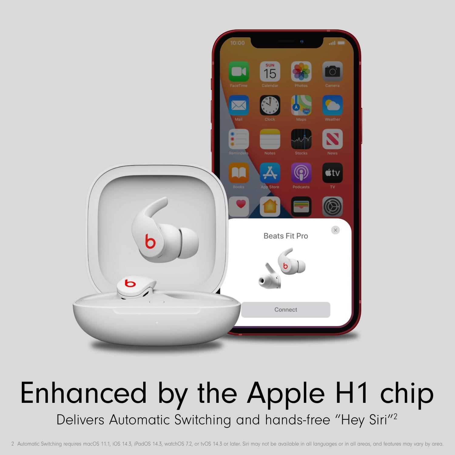 These Beats Fit Pro earbuds are the perfect companion for your active lifestyle. Music, videos, and games feel super immersive thanks to Spatial Audio with dynamic head tracking – it adjusts the sound as you turn your head, giving you the feeling of being at a concert. The flexible secure-fit wingtips are flexible will stay put during even the most intense workouts. Dive into your favourite playlists and podcasts undisturbed with active noise-cancelling which blocks out your surroundings. And when you need to listen out for your platform announcement, switch to Transparency mode to let the outside world in.Good to know - They're powered by the Apple H1 chip – effortlessly sync with all your Apple devices and go hands-free- They have 6 hours of listening time with 3 extra charges in the charging case- A 5-minute Fast Fuel charge will give you up to 1 hour of playback when you need a little extra juice – perfect for when you're heading out the door- You'll always be heard loud and clear on your calls thanks to dual beamforming mics which pinpoint your voice and cut out external noise and wind- The Beats app lets you manage one-touch pairing, customise the controls, check the battery levels and more.- On-device controls let you manage your music, toggle listening modes, take calls and active your voice assistant- The sweat and water-resistant design makes them perfect for workouts\n______________________________________________________Please note:- Compatible hardware and software required for Spatial Audio. Works with compatible content in supported apps. Not all content available in Dolby Atmos. Head tracking feature requires iPhone or iPad.- One-touch pairing requires an iCloud account and macOS Sierra, iOS 10, watchOS 3 or later versions.- Automatic Switching requires macOS 11.1, iOS 14.3, iPadOS 14.3, watchOS 7.2, or tvOS 14.3 or later.- Audio Sharing is compatible with Beats Fit Pro, Beats Flex, Solo Pro, Powerbeats Pro, Powerbeats, Solo3 Wireless, Powerbeats3 Wireless, Beats Studio3 Wireless, BeatsX, AirPods (1st generation or later), AirPods Pro and AirPods Max. Works with iPhone 8 or later and iPod touch (7th generation) with the latest version of iOS, and 12.9-inch iPad Pro (2nd generation or later), 11-inch iPad Pro, 10.5-inch iPad Pro, iPad (5th generation or later), iPad Air (3rd generation) and iPad mini (5th generation) with the latest version of iPadOS.