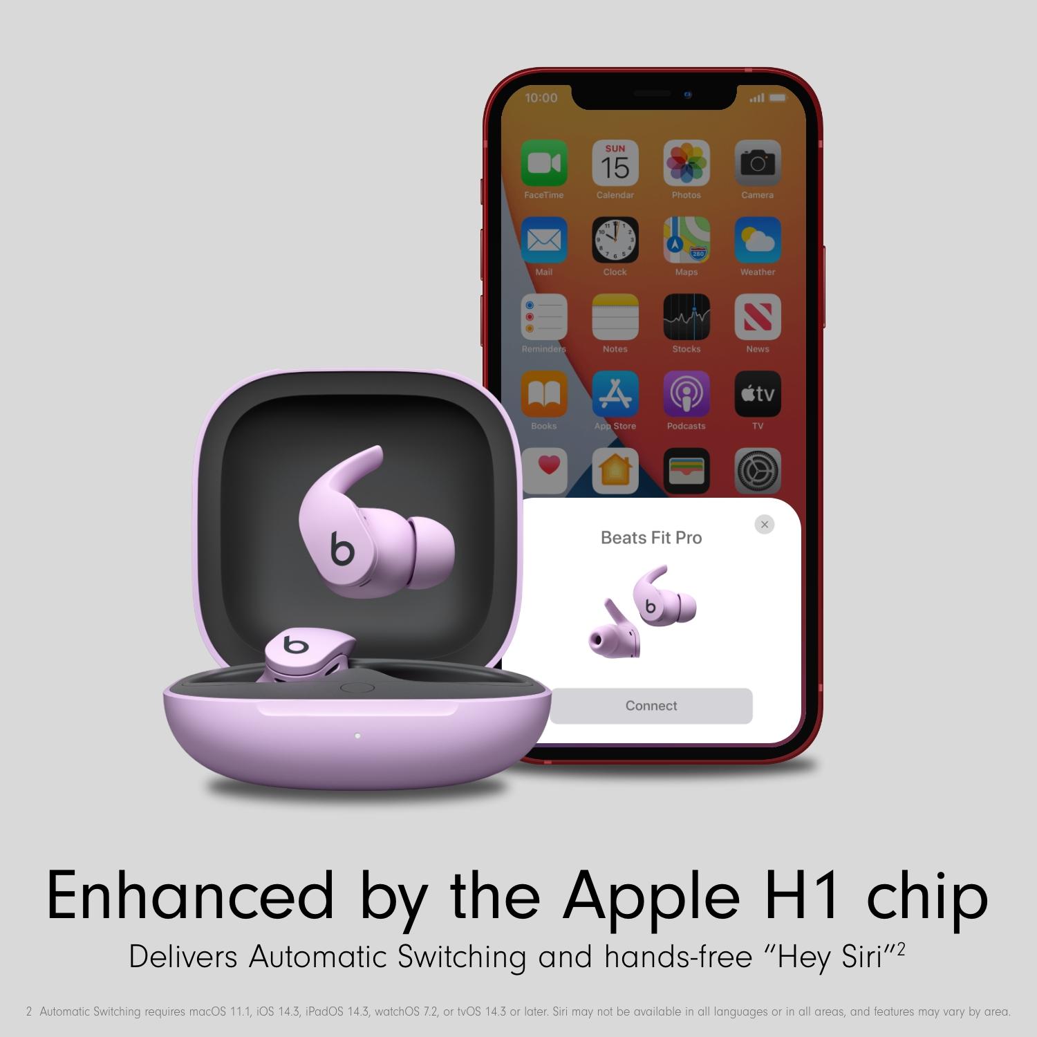 These Beats Fit Pro earbuds are the perfect companion for your active lifestyle. Music, videos, and games feel super immersive thanks to Spatial Audio with dynamic head tracking – it adjusts the sound as you turn your head, giving you the feeling of being at a concert. The flexible secure-fit wingtips are flexible will stay put during even the most intense workouts. Dive into your favourite playlists and podcasts undisturbed with active noise-cancelling which blocks out your surroundings. And when you need to listen out for your platform announcement, switch to Transparency mode to let the outside world in.Good to know - They're powered by the Apple H1 chip – effortlessly sync with all your Apple devices and go hands-free- They have 6 hours of listening time with 3 extra charges in the charging case- A 5-minute Fast Fuel charge will give you up to 1 hour of playback when you need a little extra juice – perfect for when you're heading out the door- You'll always be heard loud and clear on your calls thanks to dual beamforming mics which pinpoint your voice and cut out external noise and wind- The Beats app lets you manage one-touch pairing, customise the controls, check the battery levels and more.- On-device controls let you manage your music, toggle listening modes, take calls and active your voice assistant- The sweat and water-resistant design makes them perfect for workouts\n______________________________________________________Please note:- Compatible hardware and software required for Spatial Audio. Works with compatible content in supported apps. Not all content available in Dolby Atmos. Head tracking feature requires iPhone or iPad.- One-touch pairing requires an iCloud account and macOS Sierra, iOS 10, watchOS 3 or later versions.- Automatic Switching requires macOS 11.1, iOS 14.3, iPadOS 14.3, watchOS 7.2, or tvOS 14.3 or later.- Audio Sharing is compatible with Beats Fit Pro, Beats Flex, Solo Pro, Powerbeats Pro, Powerbeats, Solo3 Wireless, Powerbeats3 Wireless, Beats Studio3 Wireless, BeatsX, AirPods (1st generation or later), AirPods Pro and AirPods Max. Works with iPhone 8 or later and iPod touch (7th generation) with the latest version of iOS, and 12.9-inch iPad Pro (2nd generation or later), 11-inch iPad Pro, 10.5-inch iPad Pro, iPad (5th generation or later), iPad Air (3rd generation) and iPad mini (5th generation) with the latest version of iPadOS.