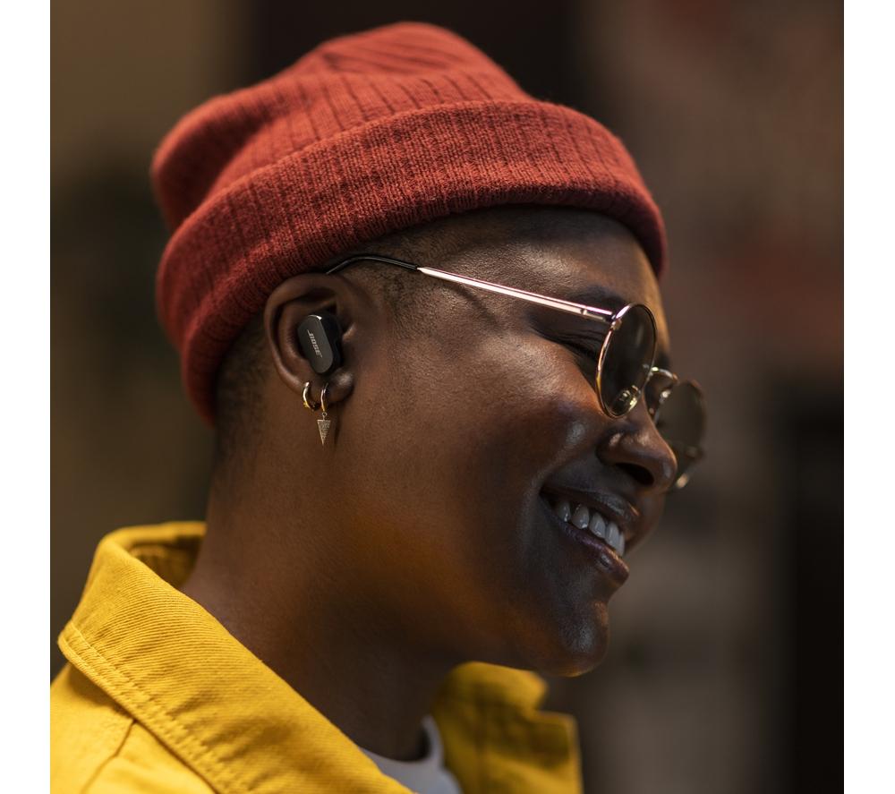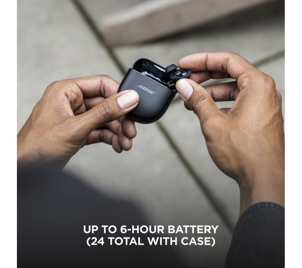 Like a sharp suit, everything is better when it's tailored to you. The Bose QuietComfort II Earbuds use CustomTune sound calibration that tweaks the sound and noise-cancelling to suit the way you listen. And these aren't just any old noise-cancelling earbuds. The QuietComfort II represent a revolutionary advance in noise-cancelling technology. It starts with the perfect fit for a tight seal – and the included Fit Kit makes sure you'll find it. Combined with mics which block out background chatter, you'll be able to appreciate songs in a whole new light – and catch every word of your audiobook. As you'd expect from Bose, there's no compromise when it comes to sound. Each wireless earbud is packed with custom-designed tech that delivers life-like and balanced sound with nuance, clarity, and depth. Good to know - You won't need to reach for your phone with simple touch controls for playback, calls, and noise-cancellation - Your music will automatically pause when you remove an earbud, so you can easily have a chat - Aware Mode lets you hear what's going on around you – and you can switch on ActiveSense to soften loud noises, like a passing bus- Noise-rejecting mics pick out your voice from your surroundings, so you'll be heard loud and clear on calls - The buds are water resistant, so you don't have to worry about getting caught in a downpour- You can take one of the earbuds out of your ear and the other one will keep playing – amazing for phone calls - Between listens, pop the earphones back in the case for up to 24 hours of listening time