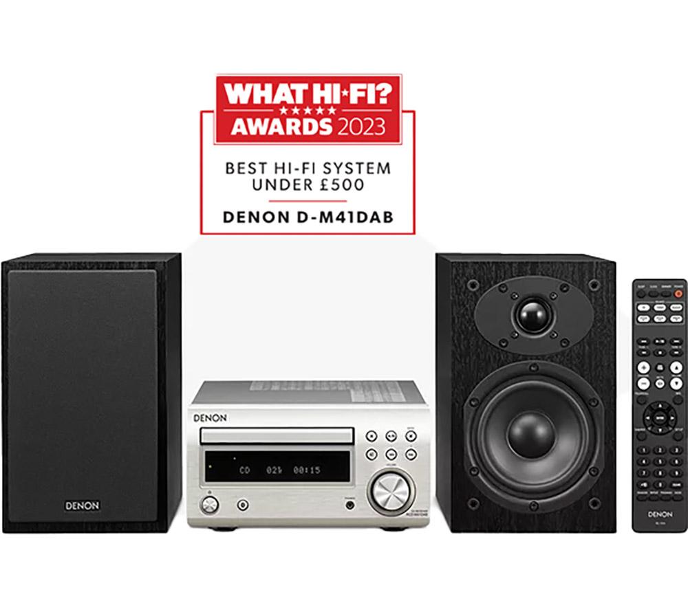 Top features:- Powerful 60 W sound from a small hi-fi system - Listen to CDs, and FM and DAB+ radio stations - Stream music wirelessly from your smartphone or tablet - Purer sound thanks to a Triple Noise Reduction Design Powerful 60 W soundIf you're running low on space but still want big sound, you'll love the Denon DM-41DAB Wireless Traditional Hi-Fi System. It delivers a powerful 60 W of audio from two speakers, for sound that fills small and medium-sized rooms. You'll be surprised at how loud a small hi-fi can be.Listen to CDs, and FM and DAB+ radioExpand your music options with multiple ways to listen. This hi-fi system has a CD player and FM, DAB and DAB+ radio stations to listen to.Stream music wirelesslyBuilt-in Bluetooth means you can wirelessly stream music from your smartphone, tablet or PC. So you're not just restricted to your CD collection, or what's on the radio.Purer soundThe Denon DM-41DAB is designed for purer sound from within. A simple circuit design inside the hi-fi lowers noise reduction. This means cleaner, pure sound at high volumes.