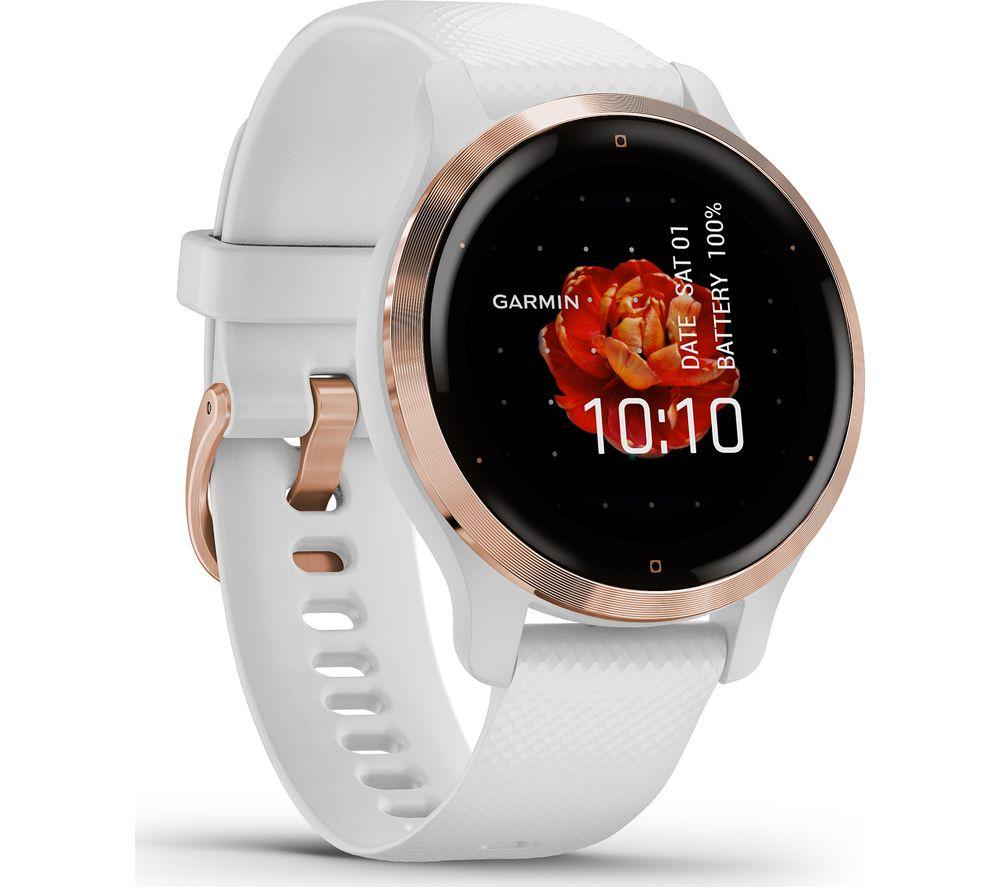 Not just a pretty face The Garmin Venu 2S is a blend of functionality and stylish design on in a small package right on your wrist. It tracks your health and workout sessions to help you better understand your body. And when it's time for a new look, you can switch up the strap or download new faces from the Garmin Connect IQ store. Smart notifications let you know what's going down in the group chat without being glued to your phone. See your texts and instant messages on the bright, AMOLED touchscreen. With up to 10 days of battery life you can don't have to worry about charging it every night. Work out with Garmin The Venu 2S comes with 25 built-in sports apps for both indoors and out. It can keep track of your vitals during your walks, runs, yoga, cycling, Pilates, hiking, indoor climbing and many more. You can even create your own workouts with Garmin Connect. For peace of mind when you're going on a run somewhere new, incident detection will let your location to your emergency contacts if there's an accident. Everyday health tracking Keep track of your daily step count, the floors you've climbed, and calories burned throughout the day. Body Battery finds the best times for activity and rest by measuring your heart rate, blood oxygen, menstrual cycle, hydration, respiration, sleep and more. Keep the music playing Stay motivated as you stretch. Connect your Bluetooth headphones to stream music straight from Spotify, Amazon Music or Deezer. There's also storage for up to 650 songs. That's one long workout playlist. Pay with your watch Instead of rummaging around in your bag looking for your wallet, use Garmin Pay next time you're grabbing your morning coffee. Simply swipe your Garmin Venu 2S against the reader, just like using contactless on your phone.