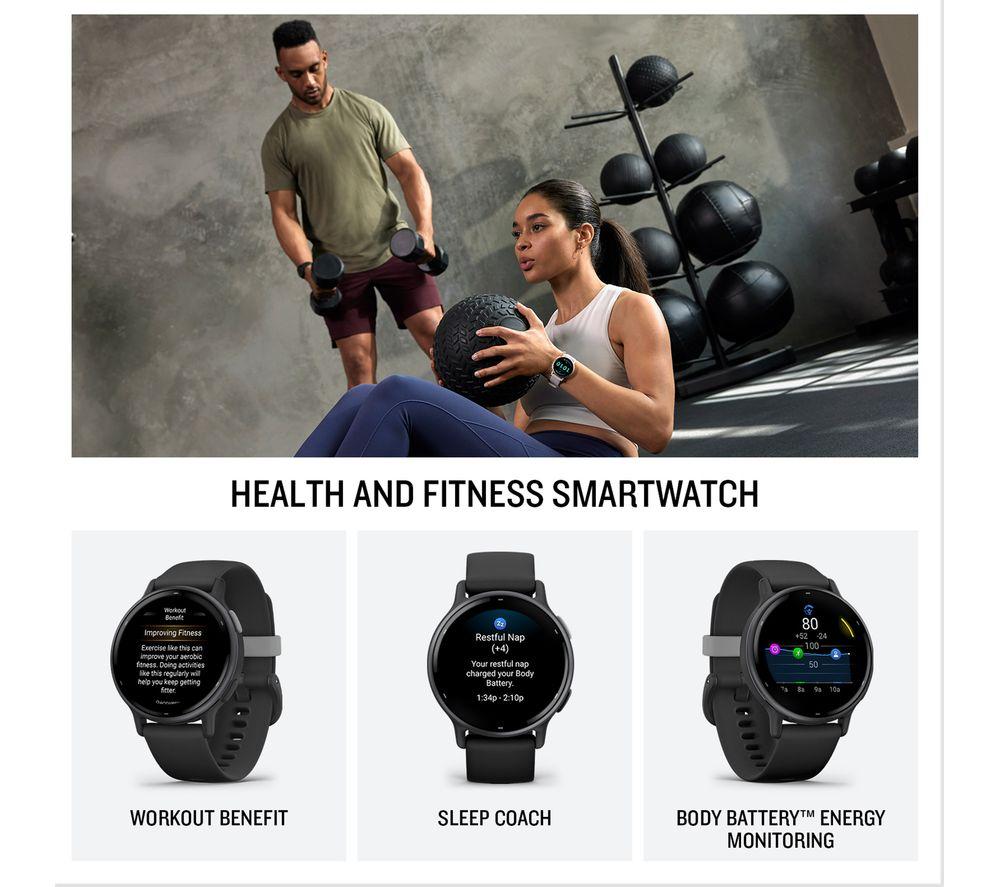 Keeping active is important but so is getting your rest. This Garmin vívoactive 5's Body Battery energy monitoring gives you personalised insights into your sleep, naps, stress levels and workouts. It helps you better understand when you need to take it easy or when you're primed and ready to go again. The Sleep Coach creates your very own sleep score with handy tips on how to get a better night's kip. And with the Morning Report, you'll be ready to hit your fitness goals as soon as you wake up. It sends loads of useful information like your sleep patterns and daily workout routines right to your wrist, so you won't have to reach for your phone.Good to know- Hit your stride with offline playlists - you can save tracks from Spotify, Deezer or Amazon and leave the phone at home- You get up to 11 days of battery life in smartwatch mode, and up to 21 hours in GPS mode- Wheelchair mode tracks pushes instead of steps and has preloaded workouts for strength, cardio and more- Keep a close eye on your ticker with the gen 4 heart rate sensor- When it all gets too much, give your mind a break with guided meditation practices- Pair it with your smartphone and get phone call, text and email notifications on your watch- Prepare for a 5K, 10K and half-marathon with the Garmin Coach, or create your own custom workouts in the Garmin Connect app- It's so much more than just a pretty face - see all your vital stats clearly on the 1.2” OLED screen____________________________________________________Please note: Offline music storage requires a premium subscription to Spotify, Amazon Music or Deezer.