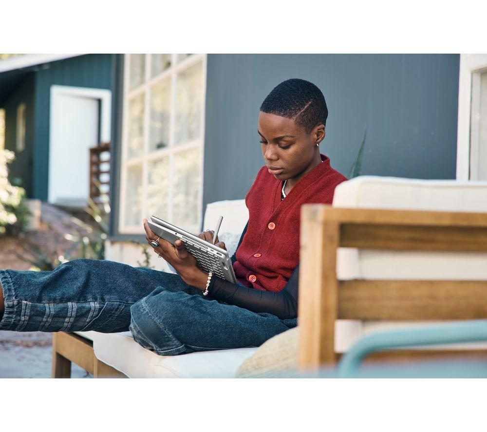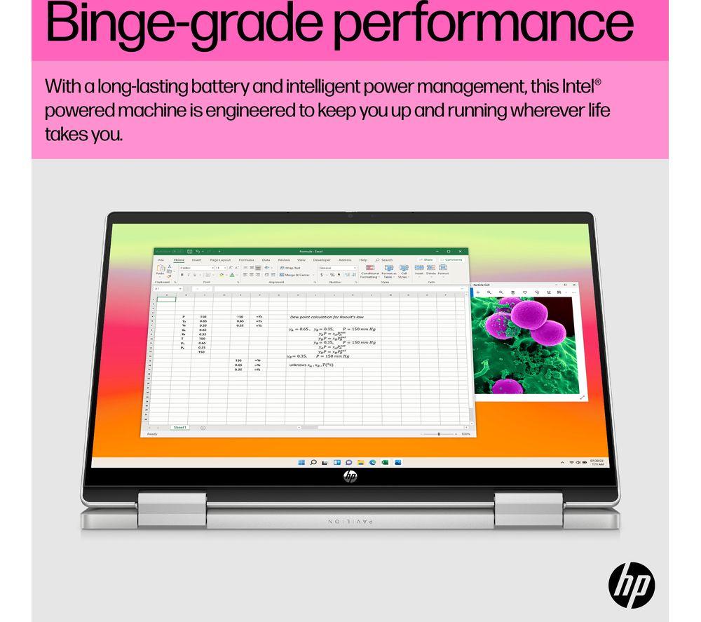 The Pavilion x360 wears many hats. In Laptop mode, it can take care of your everyday computing – browsing the web, edit Excel tables – that kind of stuff. The 13th gen Intel® Core i3 processor has plenty of power to keep things running smoothly. Flip it into Tent mode to watch a movie or run through a PowerPoint presentation on the Full HD touchscreen. Or get the keyboard out of the way and unleash your creativity in Tablet mode. Good to know - The USB Type-C port lets you charge the laptop, hook up a monitor or connect an external SSD - Need to get out of the door quickly? HP Fast Charge can get the laptop from 0 to 50% in 45 minutes - Look your best in virtual meetings with the HD Wide Vision webcam - The speakers are tuned by B&O, so your music and videos will sound great ___________________________________________________________________________ Intel, the Intel logo, Celeron, Intel Atom, Intel Core, Intel. Experience What's Inside, Intel Inside, the Intel Inside logo, Intel Unite, Iris, Pentium, Thunderbolt, the Thunderbolt logo, and Ultrabook are trademarks of Intel Corporation in the U.S. and/or other countries.