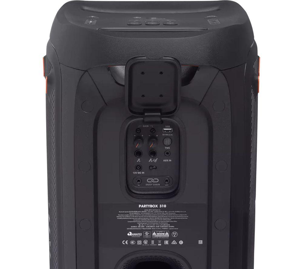 Get the party started Kickstart your night with the JBL Partybox 310 Bluetooth Megasound Party Speaker. From EDM to hip hop, you get loud, powerful sound and punchy bass without missing any of the details – all thanks to JBL Pro Sound. And since it's portable, with a rechargeable battery that lasts up to 18 hours, you can take the party outside, to the park, or to your mate's place. The integrated wheels and handle make it easy. And thanks to the IPX4 splash protection, it's perfect for the poolside. Play music wirelessly Everyone can have a go at being the DJ thanks to the Bluetooth connection. Sync up a smartphone, tablet, or laptop to the Partybox 310 and play tunes straight from your favourite streaming services. Or just preload a playlist onto a USB stick and hook that up to the Partybox 310. If you find your phone running out of juice towards the end of the night, you can use the USB port to recharge. You can also plug in a mic or a guitar for a lively jam session or impromptu band practice. Create that party vibe With five different light modes you can really set the vibe with the Partybox 310. For extra sound power, you can connect another JBL Partybox speaker wired or wirelessly. You can control the music, lighting and sound effect using the JBL Partybox app on your phone.