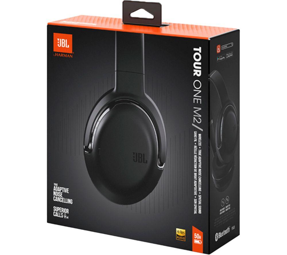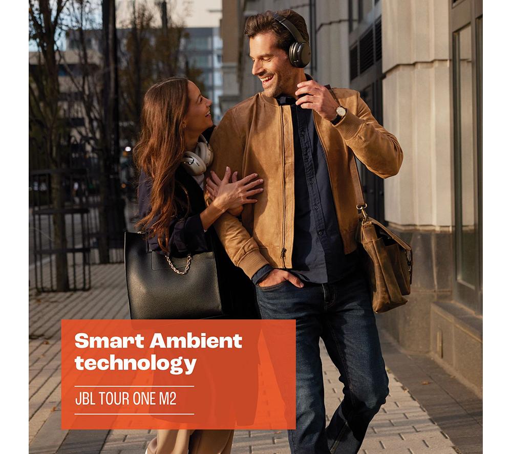 These JBL Tour One M2's are powered by hi-res certified Pro Sound technology. It means your favourite tunes will sound epic at any volume with sparkling highs, punchy mids and plenty of bone-rattling bass. With Smart Ambient technology, you can choose how much ambient sound you let in, so it's handy when you need to listen out for your train annoucement. And when you need a break from the hustle and bustle, Adaptive Noise Cancelling uses 4 noise-sensing mics to shut out the world around you. The rush hour commute has never sounded so good.Good to know- With JBL Spatial Sound, you can enjoy your music, movies and games in virtual surround sound- The 4-mic Crystal Call algorithm means you'll be heard loud and clear on your calls, even when it's blowing up a storm outside- You get up to 50 hours of listening time on a single charge – that's one hell of a playlist- Need a quick boost? Speed charge for just 10 minutes and get an extra 5 hours of battery- It works with Amazon Alexa and Google Assistant - skip tracks, crank the volume or check the weather using just your voice- Take control of your tunes with the JBL Headphones app and fine tune the EQ, turn on ANC or adjust ambient levels