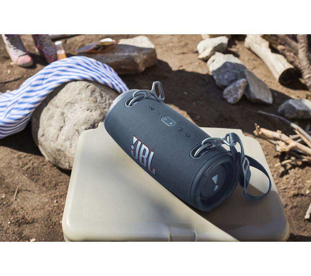 Listen all day  Bring a party-proof music setup wherever you go with the JBL Xtreme 3 Portable Bluetooth Speaker. This new generation features even more power, updated Bluetooth and lighter weight while offering better protection at the same time. With a battery that can last up to 15 hours on a single charge, the JBL Xtreme 3 is ideal for days in the park, festivals and adventures. Passive bass radiators can be seen on both sides of the unit, so you're able to hear the percussion and bassline exactly as the producer intended, even outdoors.  And if you're out for the whole day, the USB port makes a handy charging station for your phone or tablet. Keep the music going without worrying about drained devices.  Pair two devices  Sometimes it's nice to sit back and discover what your friends have been listening to. The JBL Xtreme 3 lets you do just that with Bluetooth 5.1 connectivity. You're able to connect two phones at the same time, so you can either take a break at the controls or take turns supplying the tunes with a friend.  Connect over 100 speakers  Amplify your Xtreme 3 listening experience thanks to the JBL PartyBoost app. As well as simplifying the setup process, it's great for adding speakers to your party and making the sound that much more immersive. With the ability to add over 100 speakers, you'll never find the sound falling flat.  Take your speaker to the pool  Whether you're at the beach, by the pool or exploring, you don't need to worry about shielding your JBL Xtreme 3 Portable Bluetooth Speaker from the elements. An IP67 rating means that your speaker will sound glorious even if it gets dropped in water a metre deep. So, splashes and spills will never rain on your parade.