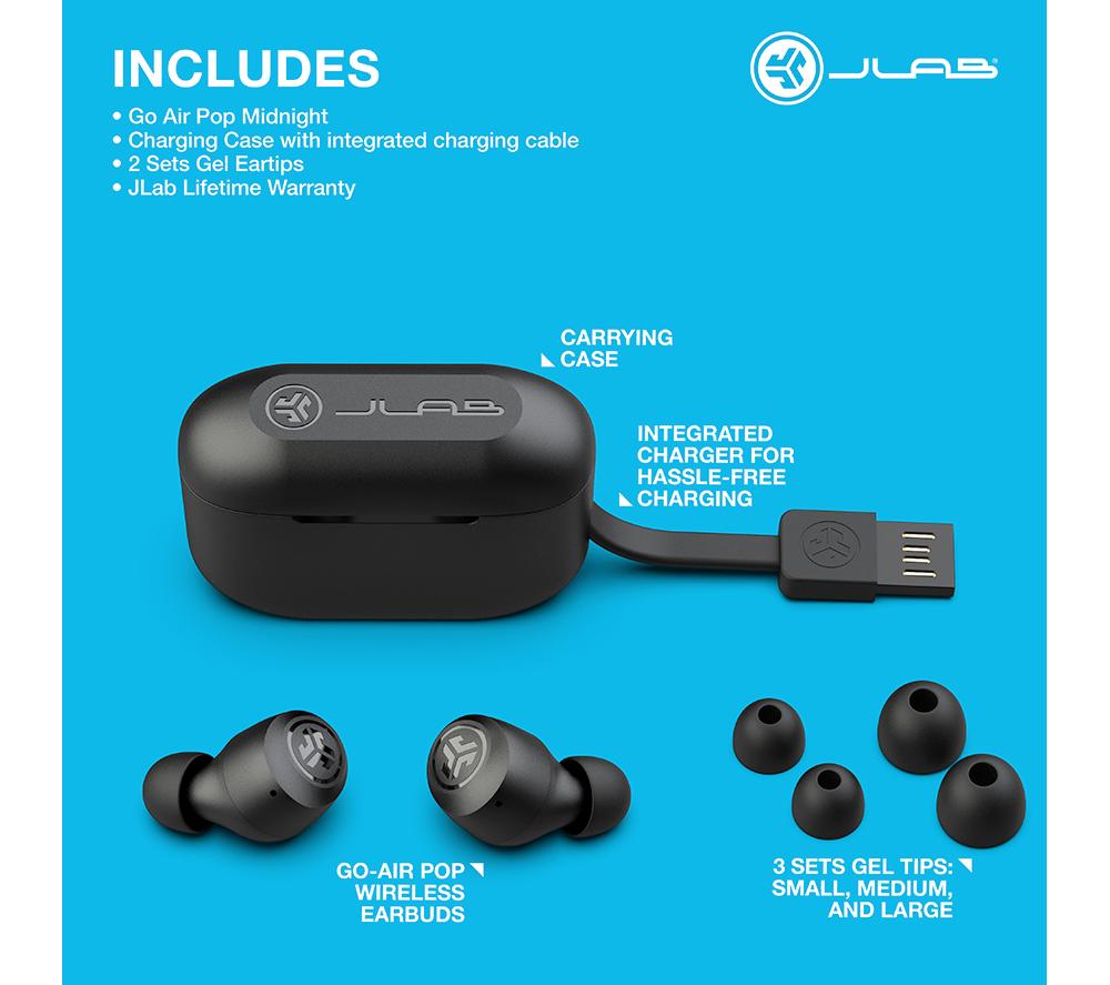 • Box contents :- JLab GO Air POP Wireless Bluetooth Earbuds- Charging case with charging cable- Set of gel tips x 3
