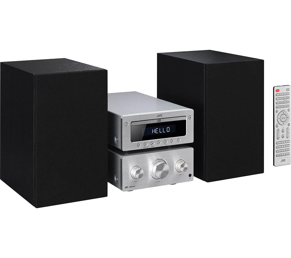 Elevate your home entertainment with this JVC wireless Hi-Fi system. Connect your smartphone or tablet via Bluetooth and stream music right from your music library or streaming services. The 100 W speakers kick out powerful, room-filling sound with plenty of bass. And whether you want to boost the low end or tweak the highs, you can shape the sound to your liking with the Bass and Treble controls. Or why not use one of the 5 presets to match your music - Classic, Rock, Jazz, Pop and Flat.Good to know- With the CD player, USB and aux-in, you get more ways to listen to your music- There's 60 preset radio stations across DAB/DAB+ and FM with no annoying static interference- See which track is playing on the clear LCD display- Its handy remote lets you control your tracks easily from wherever you are in the room