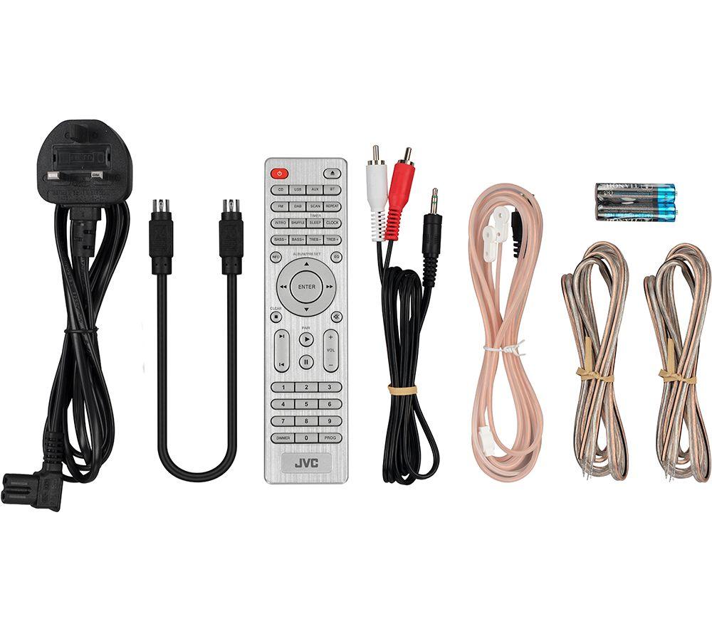 • Box contents :- JVC UX-D752 Wireless Traditional Hi-Fi System- Speakers × 2 - Remote control (attached battery) × 1- Power cord × 1 - RCA to 3.5 cable × 1 - Antenna cable × 1 - Instruction manual × 1
