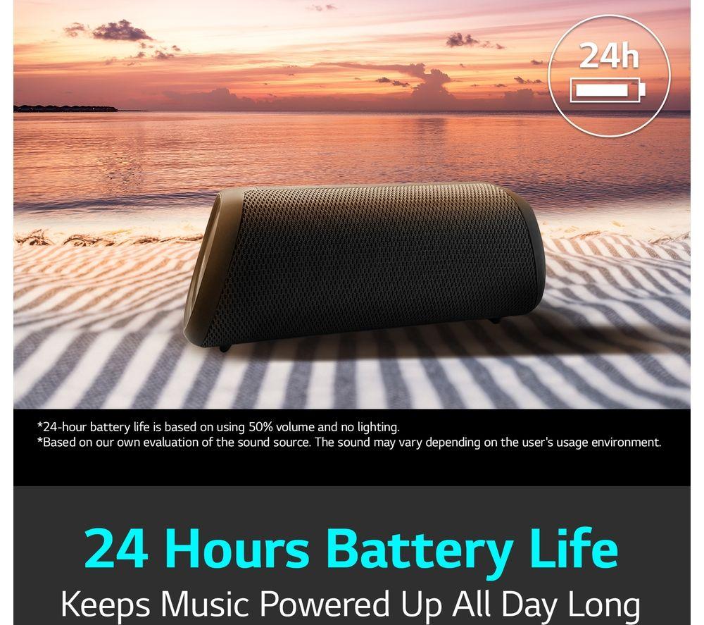 If the LG XBOOM Go XG7 doesn't get you in a party mood, nothing will. Don't let its small size fool you, this speaker packs a serious punch with 40 W of sound output. There's a track-type woofer for thumping bass and dome tweeter for clear, crisp highs. You'll hear (and feel) every distinct bass note, even when you turn the music down low thanks to the Bass Enhancement algorithm. LED lighting adds to the party vibe – play around with 16 million colours and enjoy the rainbow.Good to know- If you need to fill a large space, hit the Sound Boost button to widen the sound field- It's IP67 rated – aka dustproof and waterproof – so bring it to the beach or pool party- With up to 24 hours of battery life, the music can keep going well into the night – you can even charge your phone- Chat handsfree – and make sure everyone got their invite - with the built-in speakerphone