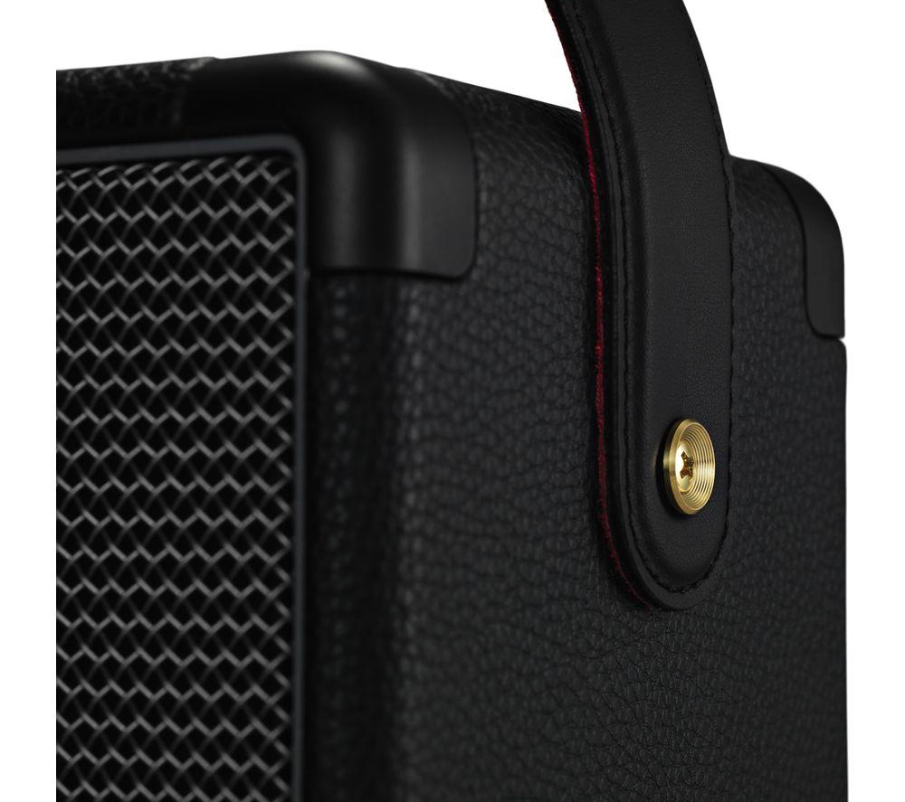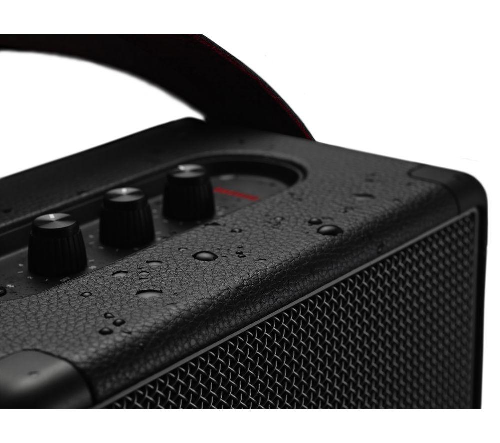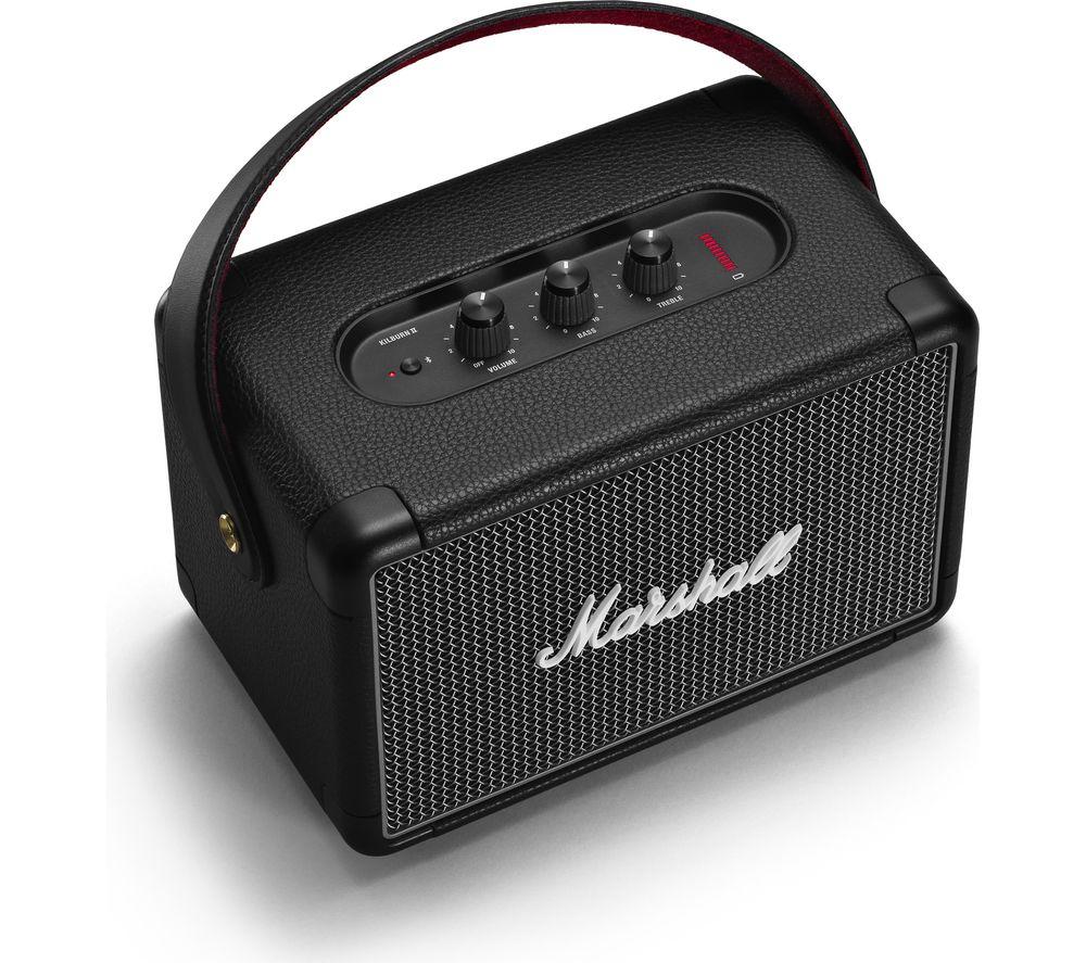 Top features: - Wireless listening with Bluetooth 5.0 - Built-in battery offers up to 20 hours of playback - Classic Marshall design with iconic logo Wireless listening Stream your favourite music from your Bluetooth-enabled smartphone, tablet, or PC to the Marshall Kilburn II Portable Bluetooth Speaker for powerful sound. With Bluetooth 5.0, it sounds just as clear as if you used a cable – though there's a jack for that too. Built-in battery Free from cables, you can setup the Kilburn II anywhere you like. The built-in rechargeable battery offers up to 20 hours of playback, or you can plug it directly into the mains. It takes only 20 minutes to get a three hour charge, and a full charge in under three hours. Classic Marshall design With a vintage-looking front fret, metal details, and the iconic script logo, the classic rock-n-roll design is unmistakeably Marshall. Don't worry about damaging the design while you're out and about, as the corners are subtly reinforced against drops and it's resistant to splashes and drizzle. The top plate has analogue controls for bass, treble, and volume, so you can fine-tune it to the exact sound you want.
