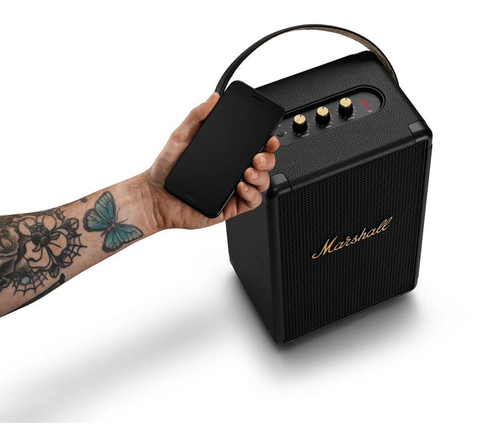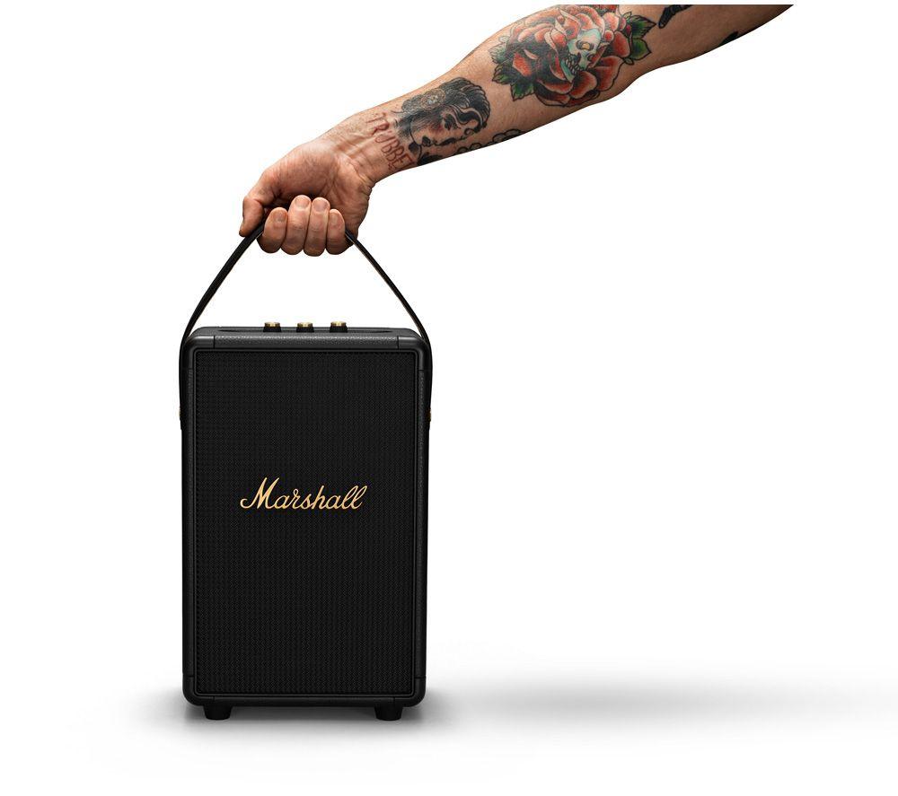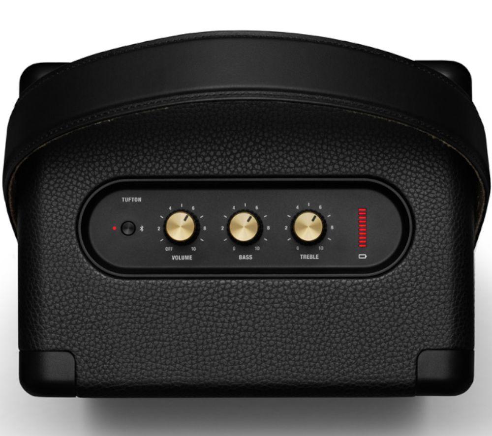 Party on the roadTake your tunes anywhere with the Marshall Tufton Portable Bluetooth Speaker. Party-proof and outdoor ready, it's made of durable materials and has an IPX2 water-resistance rating, meaning it'll cope with spills or light showers.Listen all day longEnjoy your music without worrying about charging. With up to 20 hours of playtime, you can listen all day. And it takes only 20 minutes to get an extra 3 hours, and a full charge in under 3 hours.\nBig sound\nThe Tufton uses a 3-way sound system of a tweeter, mid-range driver and subwoofer, so you'll get clear sound across all frequencies. The True Stereophonic technology gives you 360° multi-directional audio, so you can enjoy rich, balanced Marshall sound from any angle.\n\n\nEasy to control\n\nTaking turns choosing the tunes is easy. You can connect the Tufton to 2 different Bluetooth devices and enjoy different music libraries. There are control knobs on the panel, so you can tweak the bass, treble and volume to get the sound you desire.