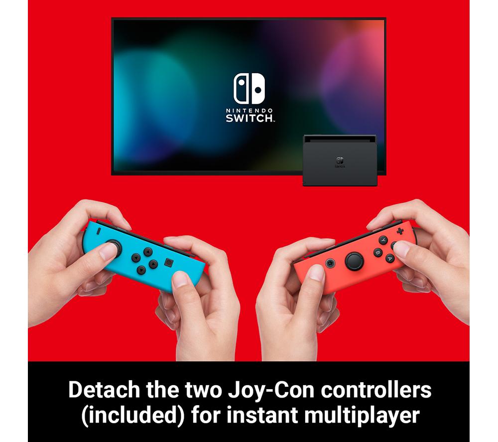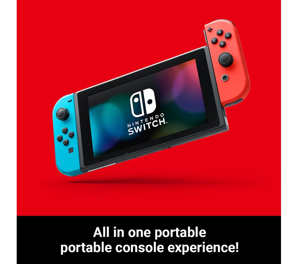 All your Nintendo friends are on the Switch. Fancy games with Mario and Luigi, Link and Zelda or Pikachu and the other Pokémon? You can find all of them and many more exclusively on Switch. And you can take them with you anywhere you go! Nintendo Switch is a hybrid console - you can either hook it to your TV, or go handheld and play on its 6.2” screen. That means you can game any way you like, whether it's a lazy afternoon with the family or a commute to school or work.Good to know - Stuck on a long journey? That's more gaming time for you, the battery lasts from 4.5 up to 9 hours, depending on your game - It comes with two wireless Joy-Con controllers - each has a full set of buttons, so you're set for multiplayer right out of the box- Gaming on a TV is super easy – just pop the Switch in the included HDMI dock and you're off - There are 32 GB of internal memory for your games and save files, and you can easily expand with a microSD card