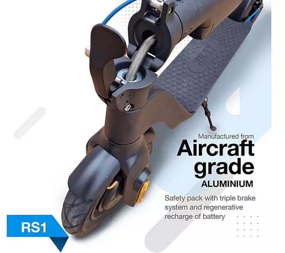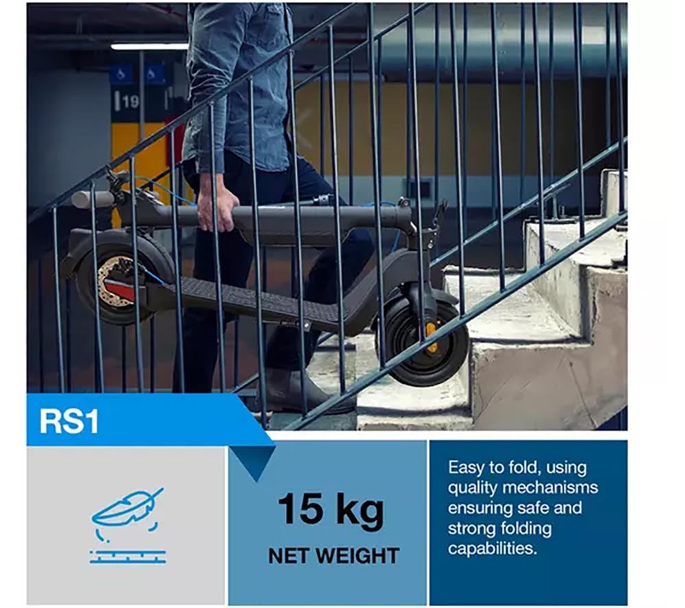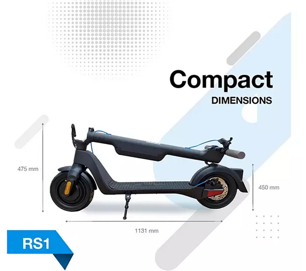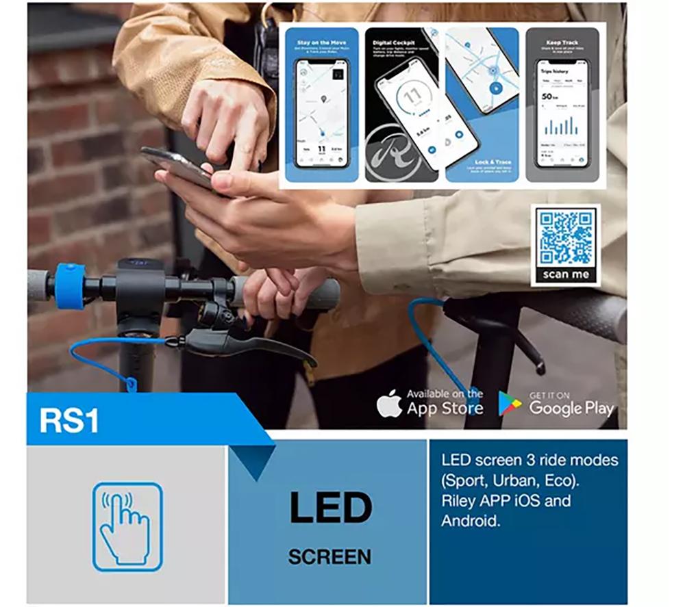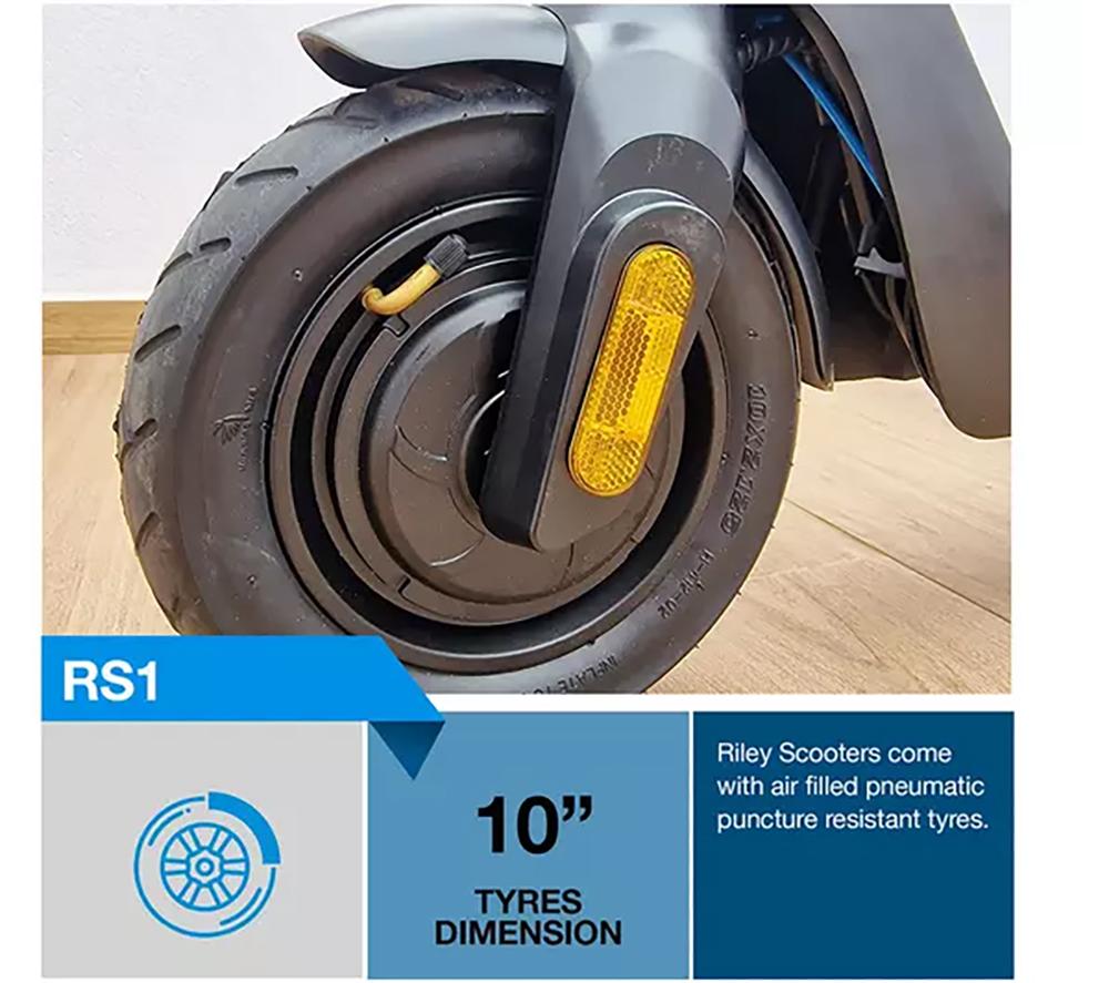 This Riley RS1 V2 electric scooter is both portable and practical thanks to its lightweight, foldable design. Fold it down in a matter of seconds for easy storage when you're done riding. There's enough battery life for 15 miles worth of riding, and the battery can be swapped out when you need to keep going. The 350 W motor gives you plenty of power and dishes out a top speed of just over 15 mph. It also makes light work of up to 15° slopes, so you won't find yourself stranded at the bottom.Good to know- You can switch between 3 drive modes depending on how you want to ride – Eco, Comfort and Performance- The battery can be fully charged in just 2 hours so it's ready to go when you are- The integrated display shows your speed, speed setting and how much charge is left in the battery- The tyres are puncture-resistant so you can ride with confidence- Its IPX4 rating means it's weatherproof – you won't have to worry if the weather takes a turn for the worse
