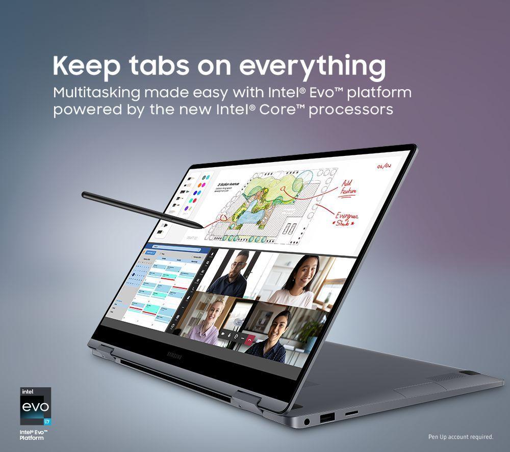 The Galaxy Book4 360 will bend over backwards to fit the way you work. Its 360° rotating hinge lets you use it as a laptop, tablet, or anything in-between. To help you speed through your workload, there's the new Intel® Core 5 processor supported by Intel® Graphics. Together they'll make quick work of all your apps and tabs. And when it's time to kick back, you can fire up a movie on the Full HD AMOLED touchscreen. It's got amazingly deep contrast and punchy colours. And thanks to the massive 68 Wh battery, you can head out without worrying about the charger. Good to know - The included S-Pen stylus gives you precise control over the touchscreen – great for taking handwritten notes or making drawings - Thanks to the dual speakers with Dolby Atmos support you'll hear every footstep in your favourite show - The Full HD webcam will make you stand out on your next video call - Multitask away with 8 GB of RAM - you can switch between apps without lag - WiFi 6E means lightning-fast internet connection for smooth browsing and streaming - There are two Thunderbolt 4 ports, so you can connect 8K monitors or super-fast SSDs - The laptop's incredibly thin and weighs just 1.46 kg – you'll barely know it's in your bag ___________________________________________________________________________ Intel, the Intel logo, Celeron, Intel Atom, Intel Core, Intel. Experience What's Inside, Intel Inside, the Intel Inside logo, Intel Unite, Iris, Pentium, Thunderbolt, the Thunderbolt logo, and Ultrabook are trademarks of Intel Corporation in the U.S. and/or other countries.