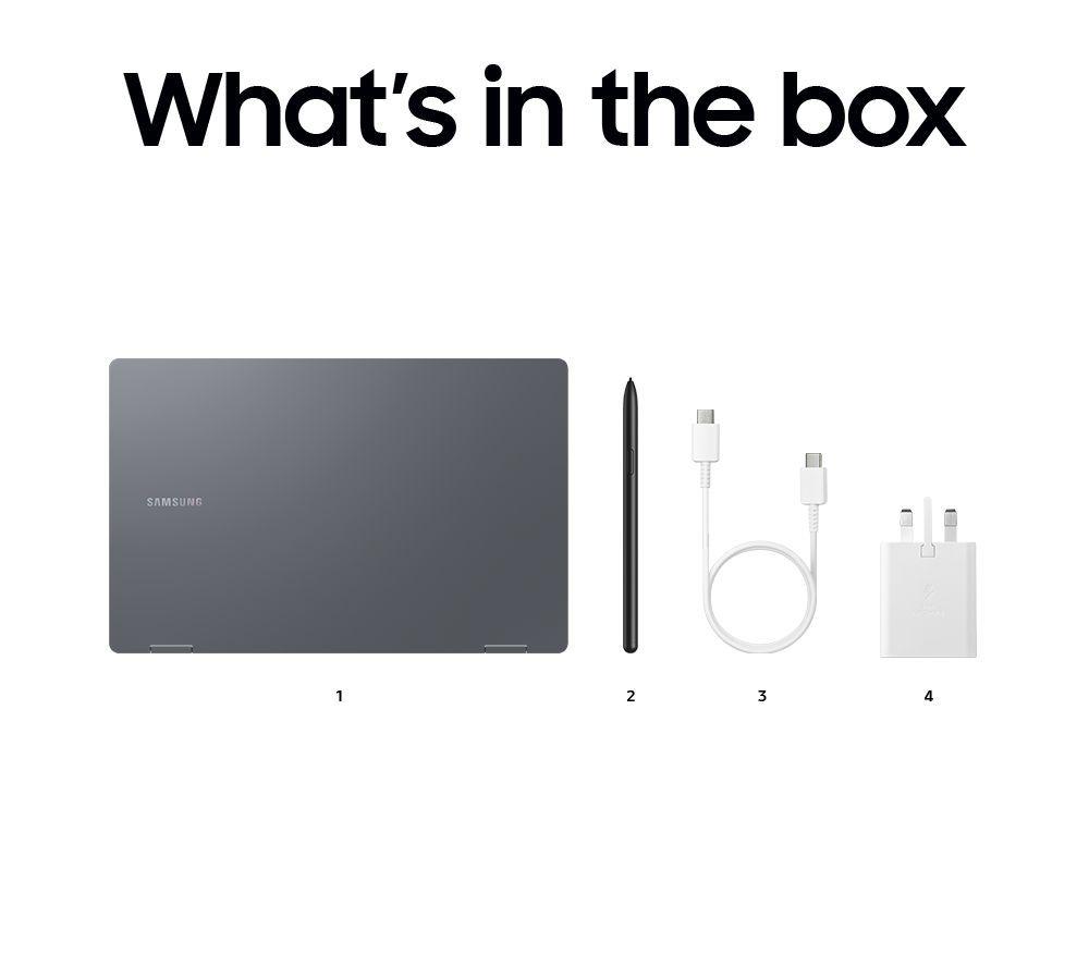 • Box contents :- Samsung Galaxy Book4 360 15.6' 2 in 1 Laptop (NP750QGK-KG3UK)- S-Pen stylus- 65 W Type-C adapter- USB Type-C data cable- Quick start guide
