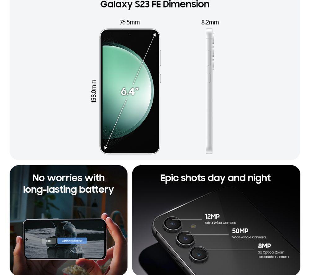 The Galaxy S23 FE has got it all – epic cameras, stunning screen and power for days. You'll always get the perfect shot out of the 50 MP camera system on the back. You can play around with the zoom and ultra-wide lenses to get the perfect framing. Even when it's dark, Nightography works its magic to make your photos clear as day. They'll look amazing on the Full HD+ AMOLED display. It makes the colours pop and it's super bright, so it's easy to read even in direct sunlight. And to make sure all your apps, games and tabs run without a hiccup, the phone is powered by an octa-core Exynos processor. To make the S23 FE even smarter, there's Galaxy AI. It's at your service 24/7 to help with everything from the small things to the big tasks.Good to know- With Photo Assist you can move subjects, remove distractions and so much more with just a few taps- Break down language barriers during calls - Live Translate lets both people speak and hear their own language- Note Assist spits out bite-sized summaries of long articles in seconds, so you can read more in less time- Where's that sweater from? Circle to Search with Google lets you search objects in your photos just by circling them- Thanks to the massive 4500 mAh battery you won't run out of juice before the day is over- The display runs at a 120 Hz refresh rate, so everything will be perfectly smooth- 5G connectivity lets you stream films and shows on-the-go – even when you're on the bus to work- The 10 MP front camera is perfect for selfies with your friends, and video calls with your family- Facial recognition and fingerprint scanning keeps your personal files safe, secure and for your eyes only- The movies you watch will sound as good as they'll look thanks to Dolby Atmos- With 25 W Super Fast Charging and wireless charging, you've got plenty of ways to top up the battery- You can wirelessly charge your gadgets from the phone with Wireless PowerShare- Splashes or rain showers don't need to bother you – the S23 FE has an IP68 rating