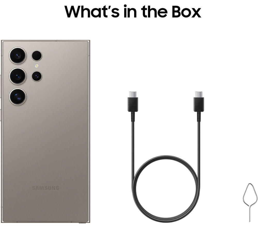 • Box contents :- Samsung Galaxy S24 Ultra- S Pen- USB Type-C charging cable- User start guide- Warranty manual- Sim ejector tool