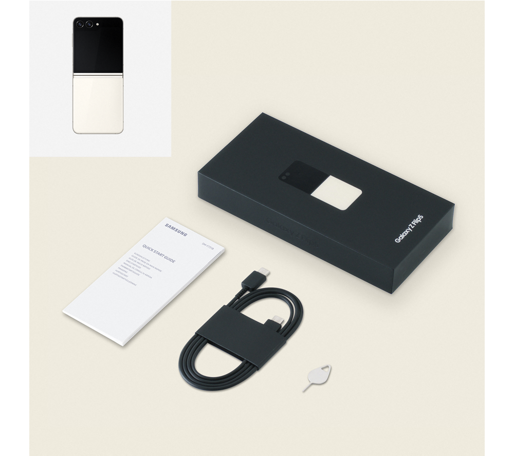 • Box contents :- Samsung Galaxy Z Flip5- USB Type-C cable- Tray pin- Warranty Card- Quick start guide