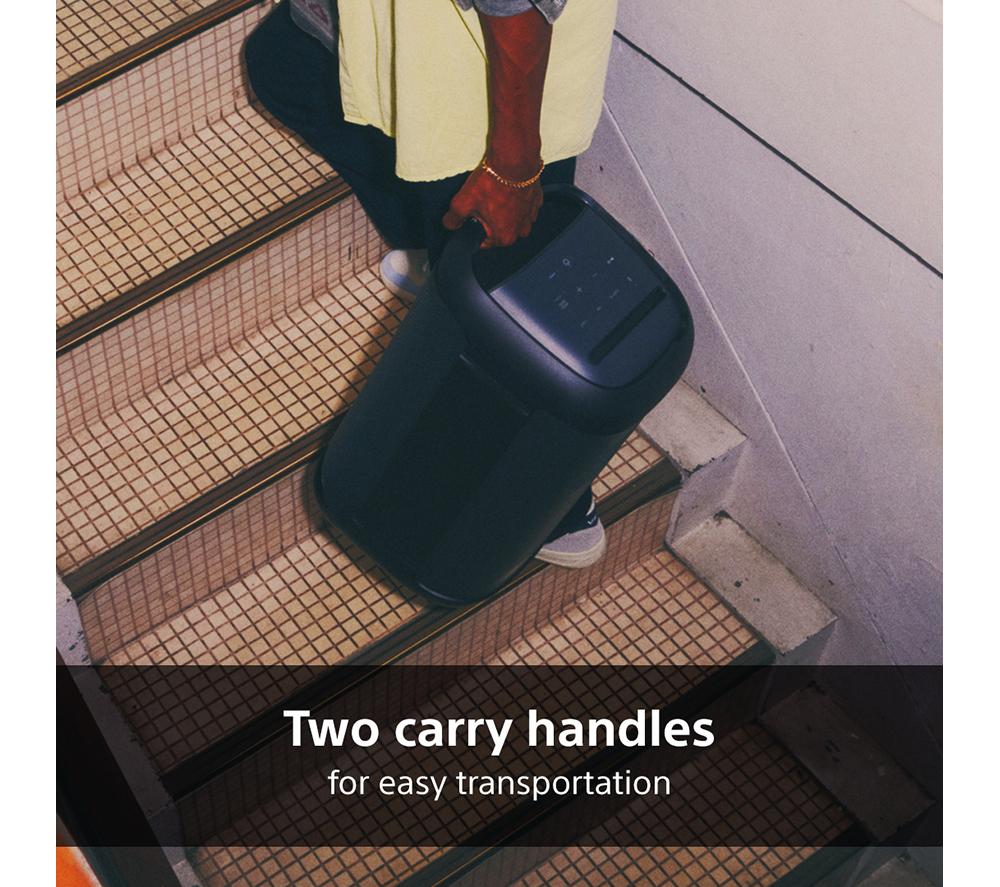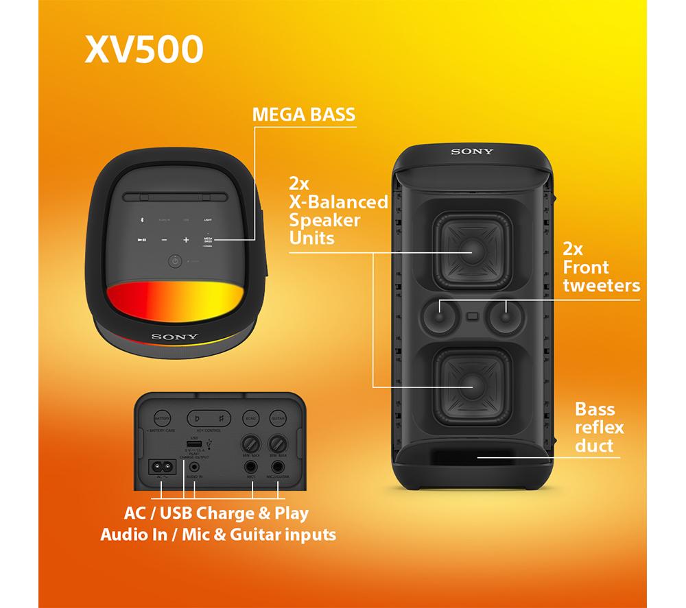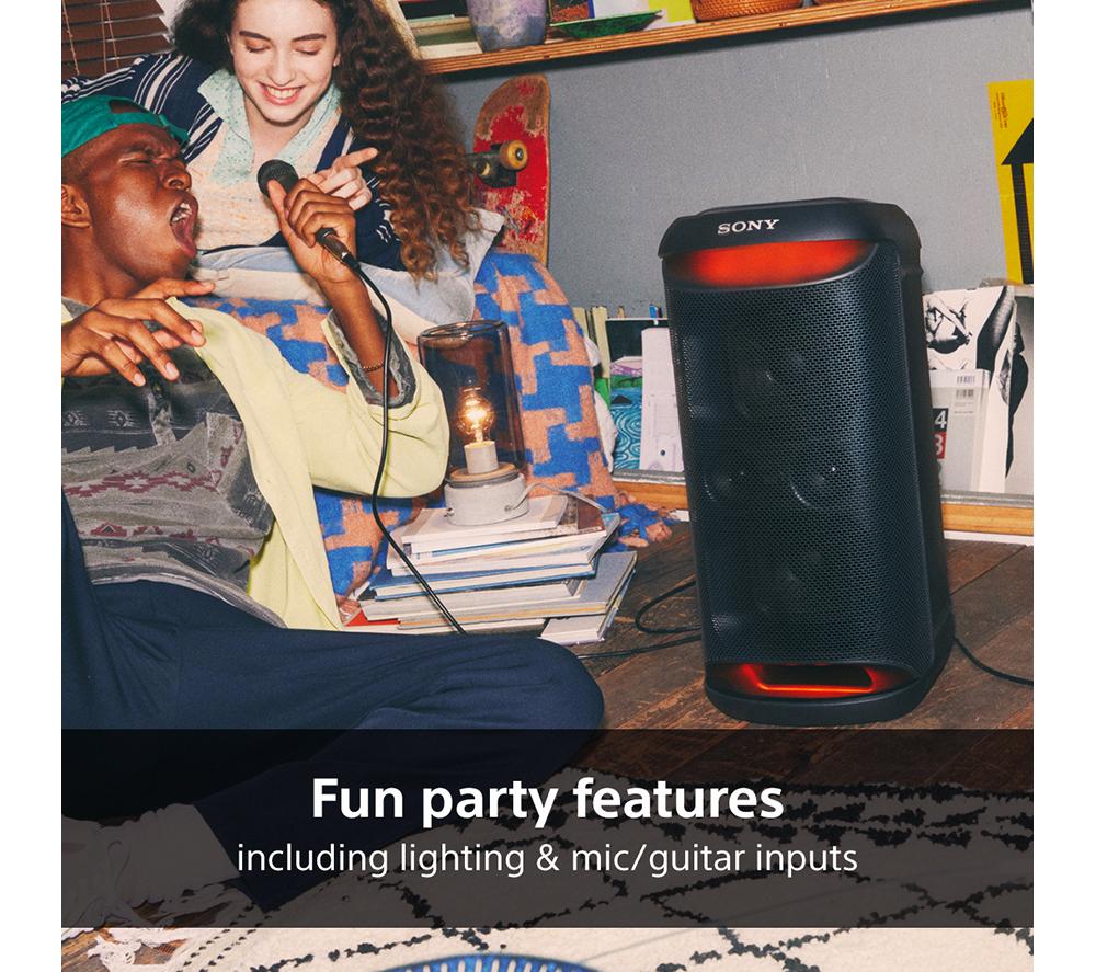 What's a party without a slammin' soundtrack? This Sony SRS-XV500's X-Balanced speakers kick out deep, powerful bass that'll have your guests throwing shapes on the dance floor in no time. Meanwhile, the two forward-facing tweeters make sure every inch of the room is covered in powerful, energetic sound. With 25 hours of battery on a single charge, you can rock out all day and night. When you need a top up, a quick 10 minute charge will give you an extra 2.5 hours of play time. And its IPX4 water resistance rating means it's not afraid of a little splash or spill. Take the party poolside for the ultimate summer shindig.Good to know- Create the perfect vibe with the multi-coloured LED lights that automatically sync to your tunes- There are two microphone inputs so you can MC or belt out those karaoke classics- If you fancy yourself as a bit of a rockstar, you can plug in a guitar and use it as an amplifier- Wirelessly pair it with 100 other compatible Sony speakers and blast your favourite jams in every room- Take the party wherever you go thanks to the sturdy carry handles